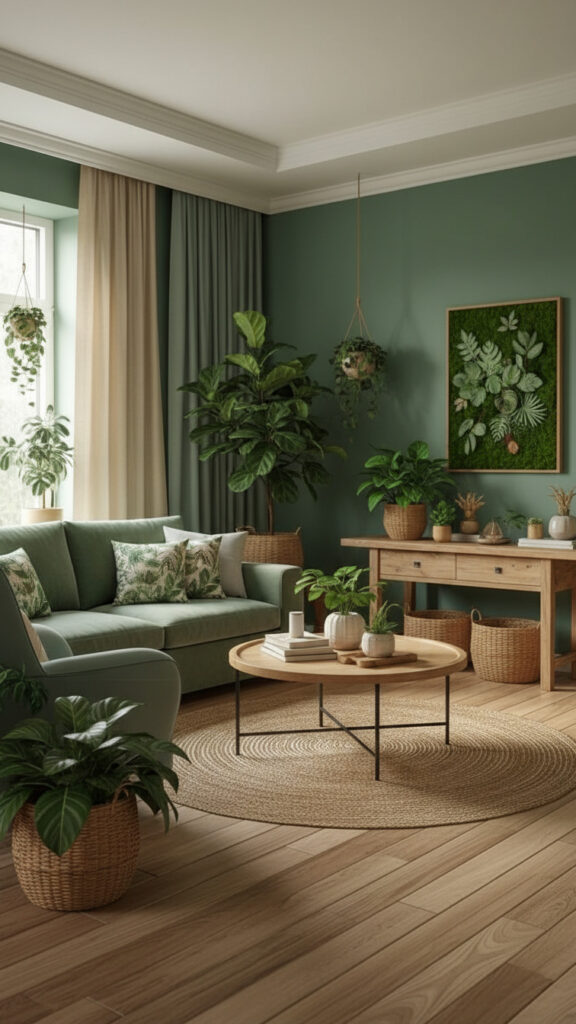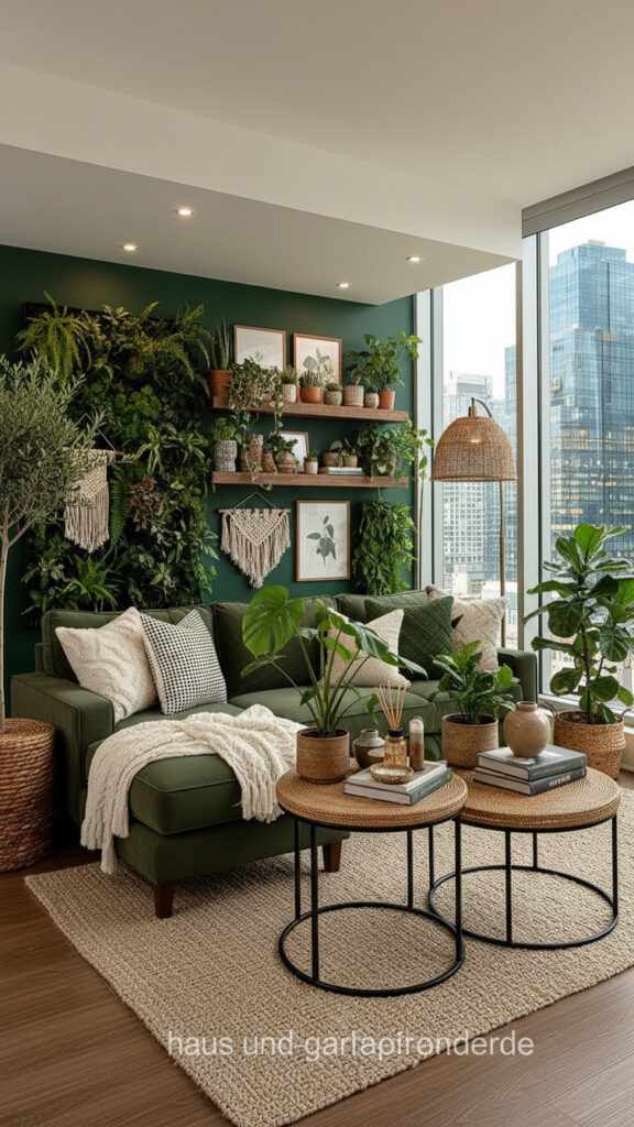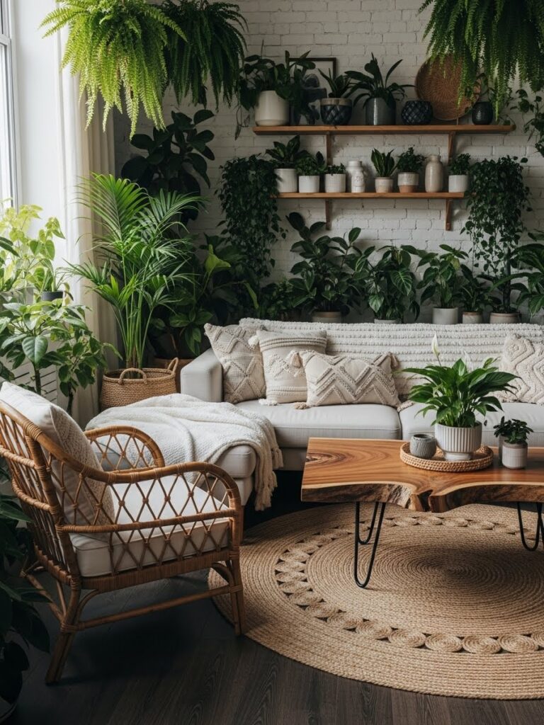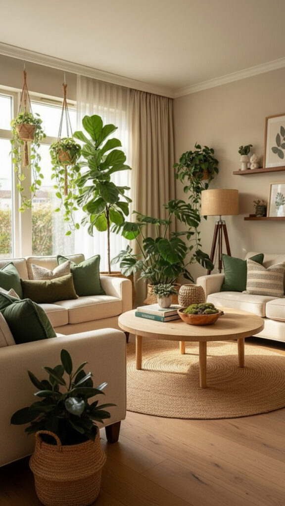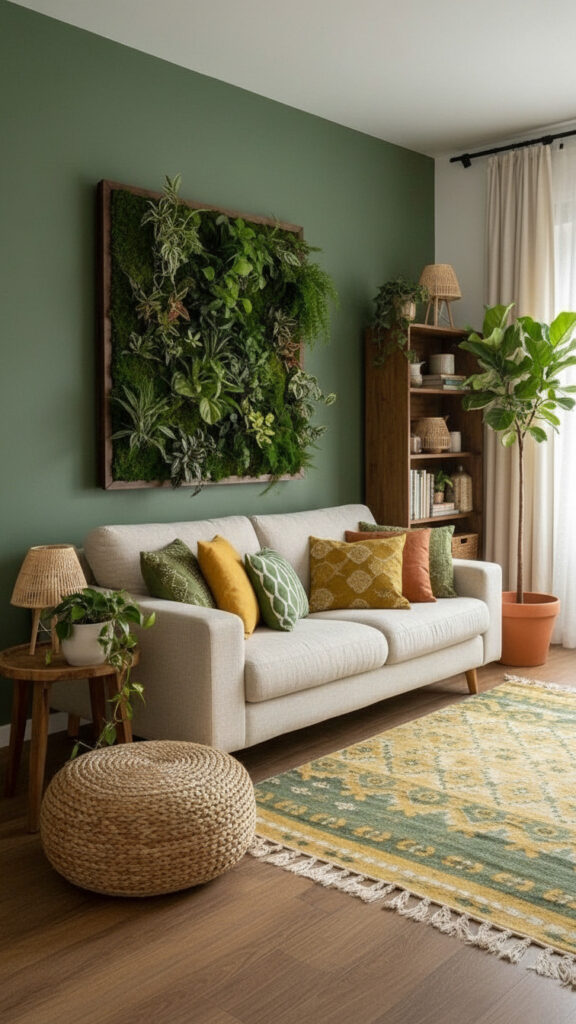 Nothing defines biophilic living room designs quite like a vertical garden. It turns a wall into a living organism.