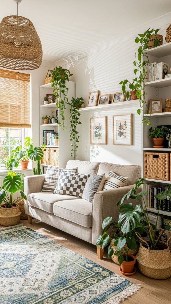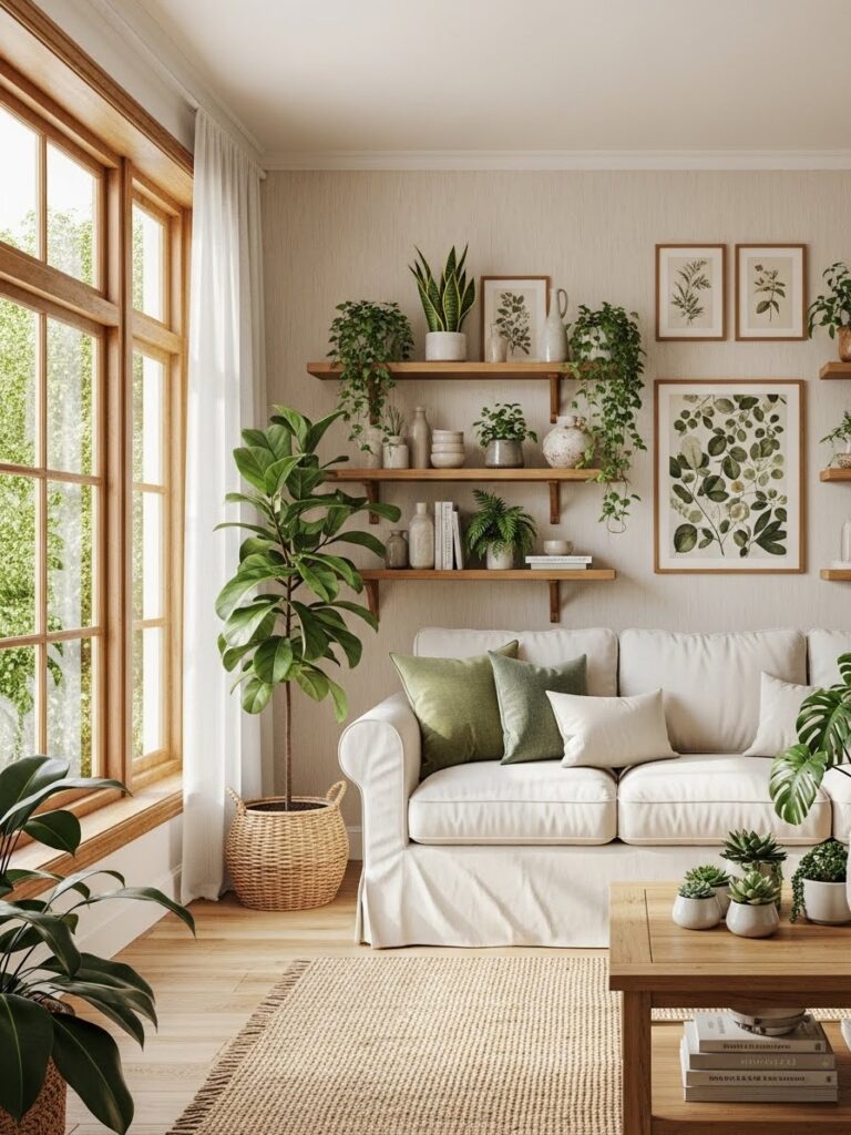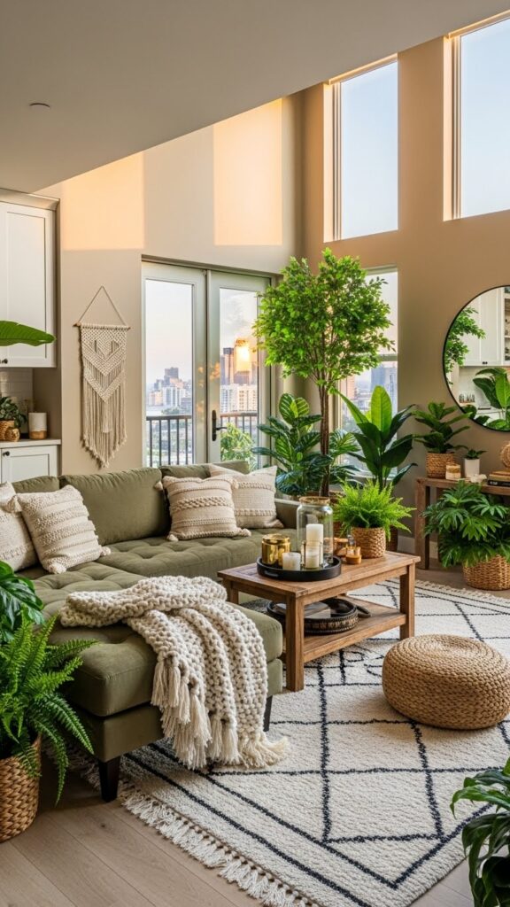You can achieve biophilic living room designs in an apartment. Use vertical space.