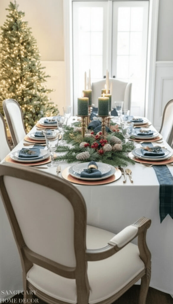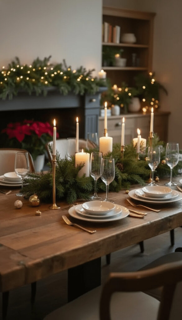 Mix these items with simple white candles. This natural elements approach feels grounded. It connects your holiday celebration to the outdoors.