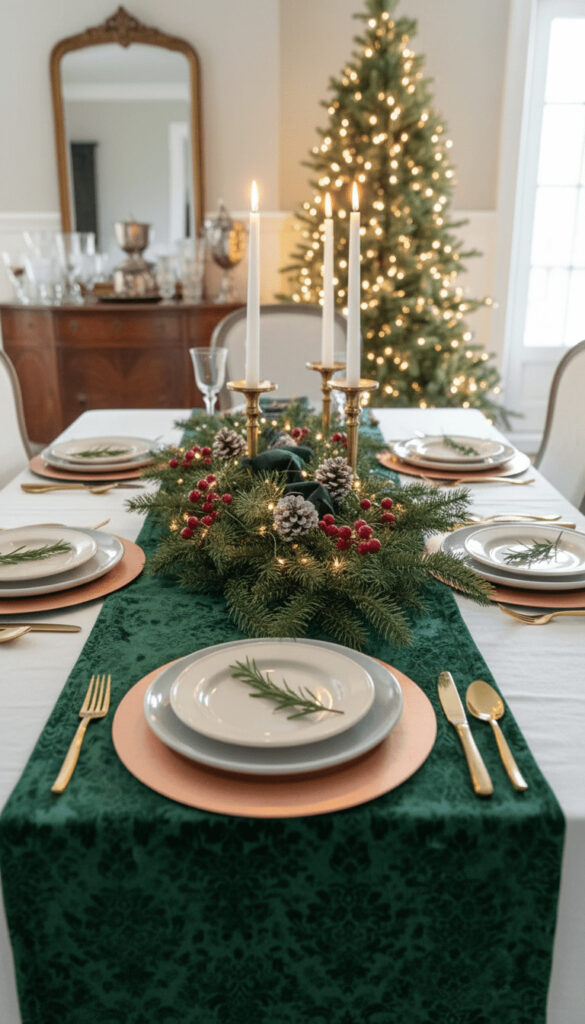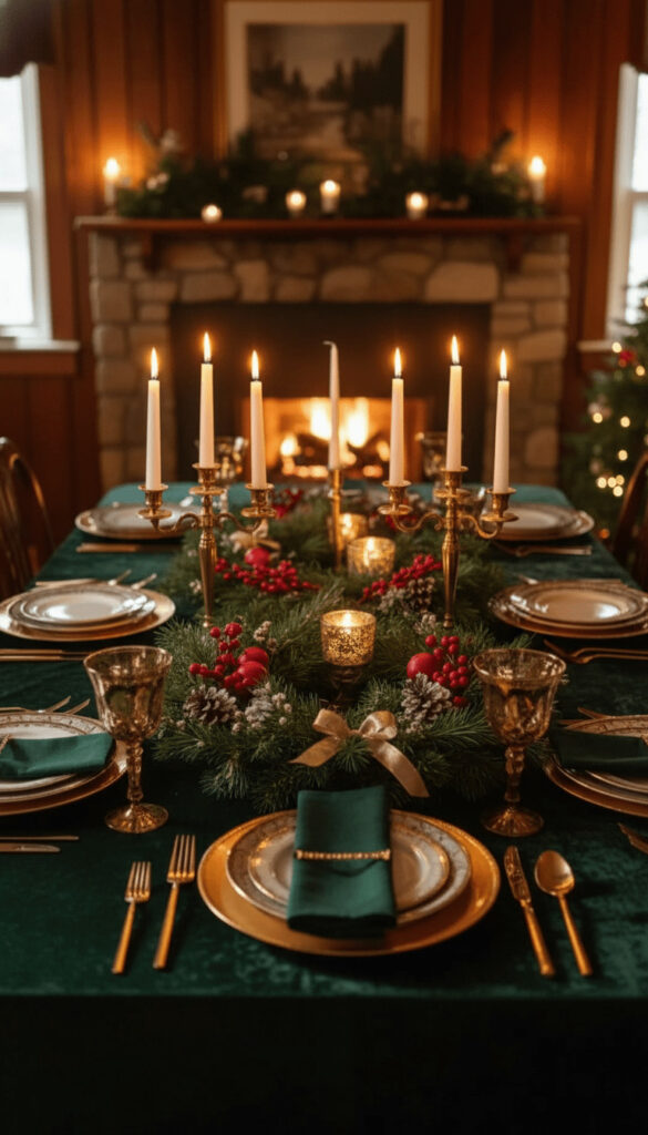 Start with a deep red tablecloth or runner. Layer fresh pine boughs down the center. The scent of real pine adds to the experience.