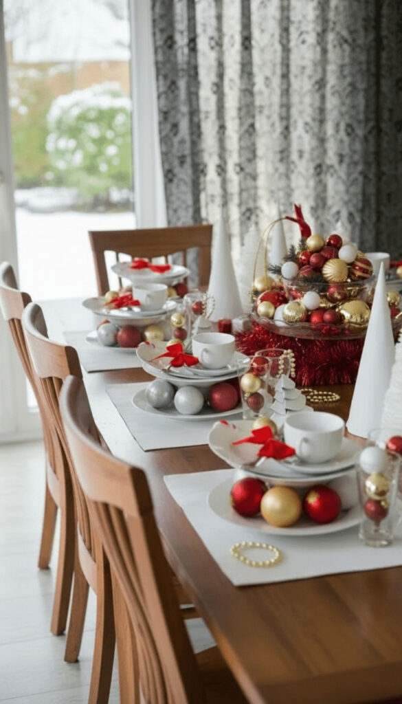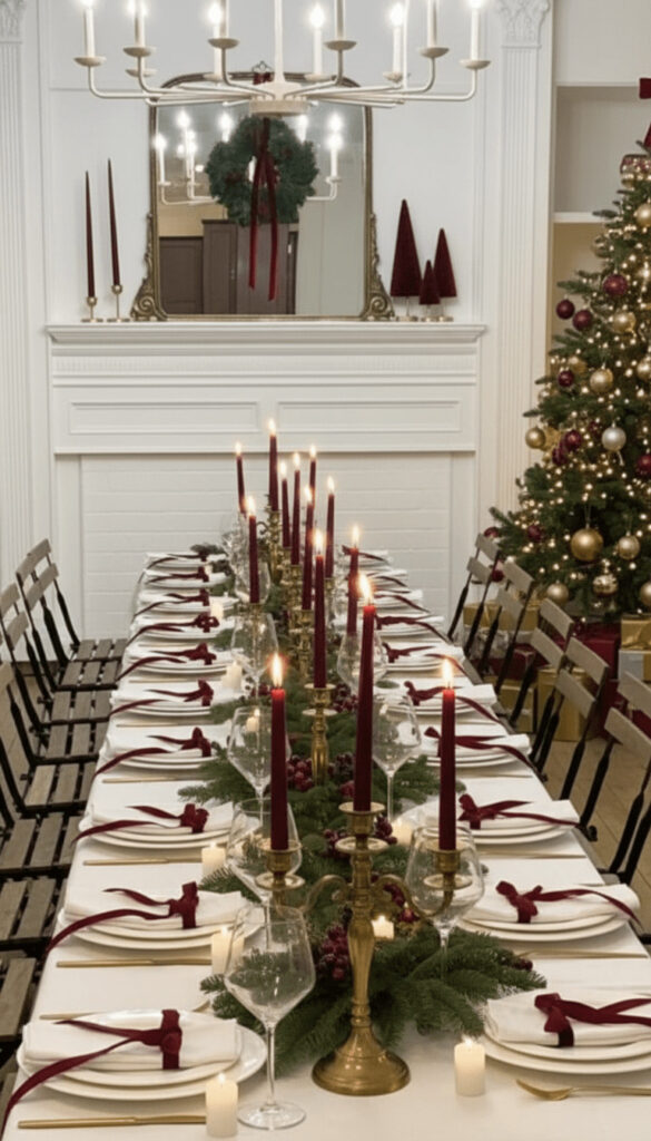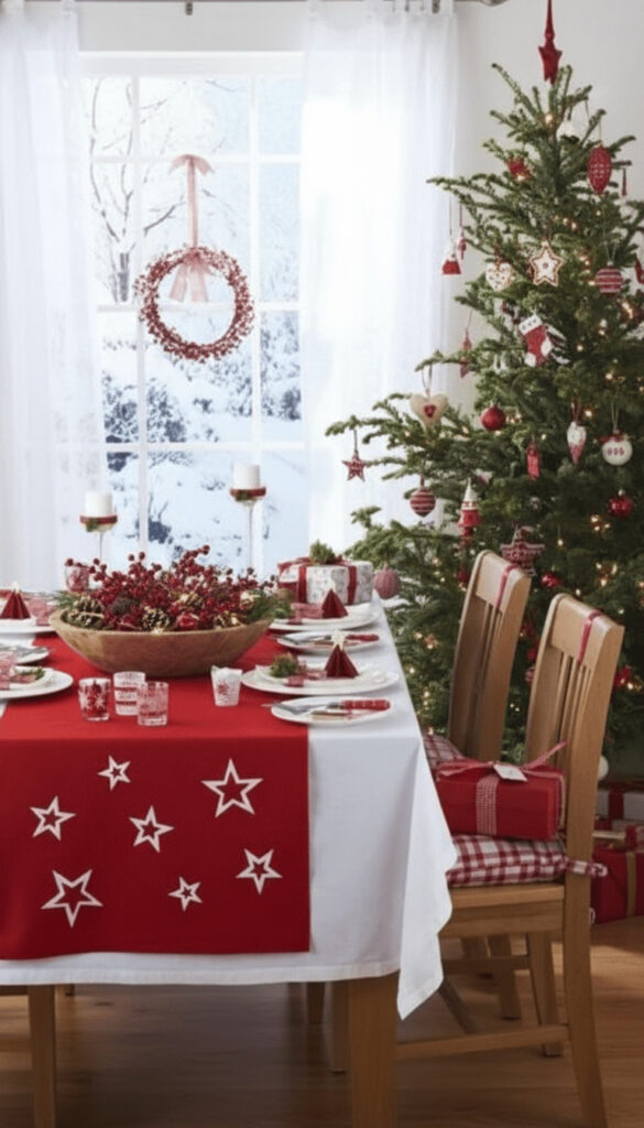 The red contrasts beautifully with a white tablecloth. It feels lively and energetic. This is a classic Christmas dinner table look.