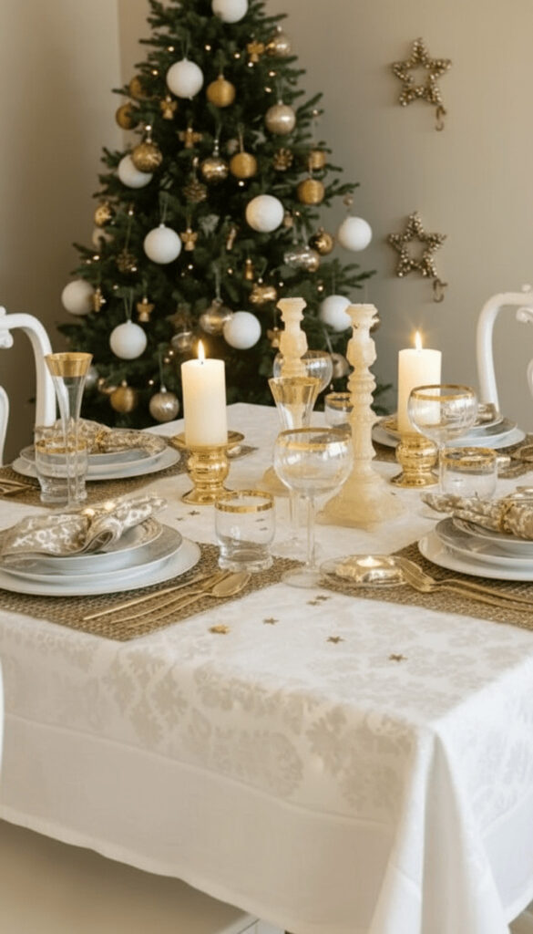 Create a snowy scene with a white theme. This elegant table setting feels sophisticated and serene. It is perfect for a formal dinner party.
