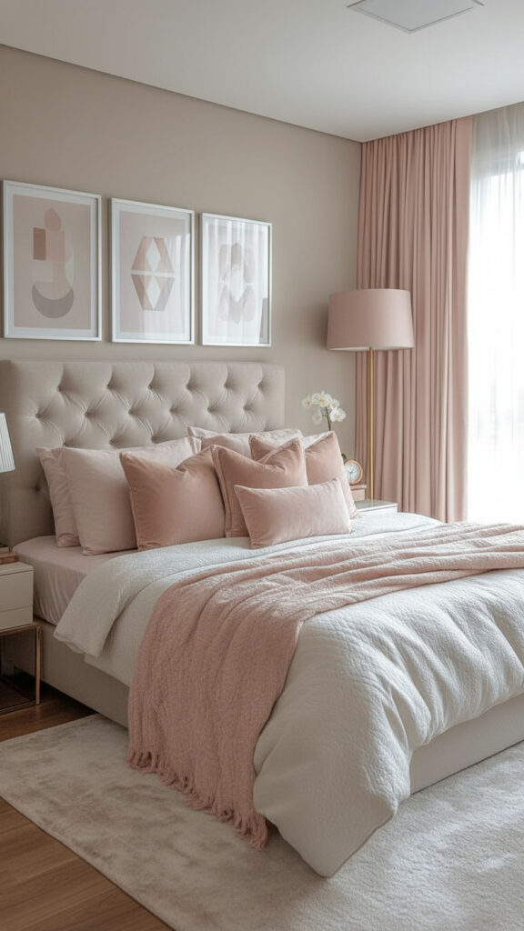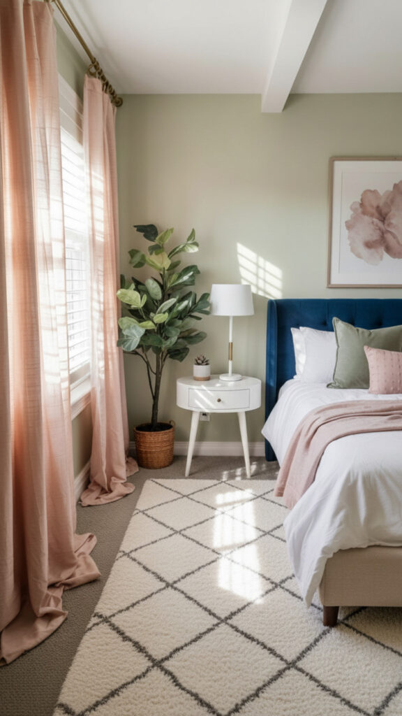 These colors promote relaxation and happiness. You can also use a neutral base like cream or white. Then, add pops of color through accessories and bedding sets.