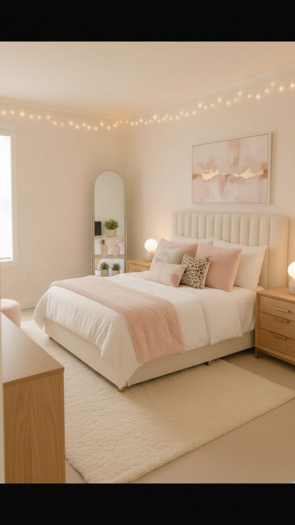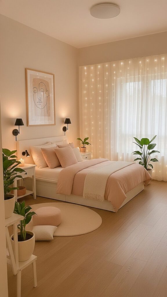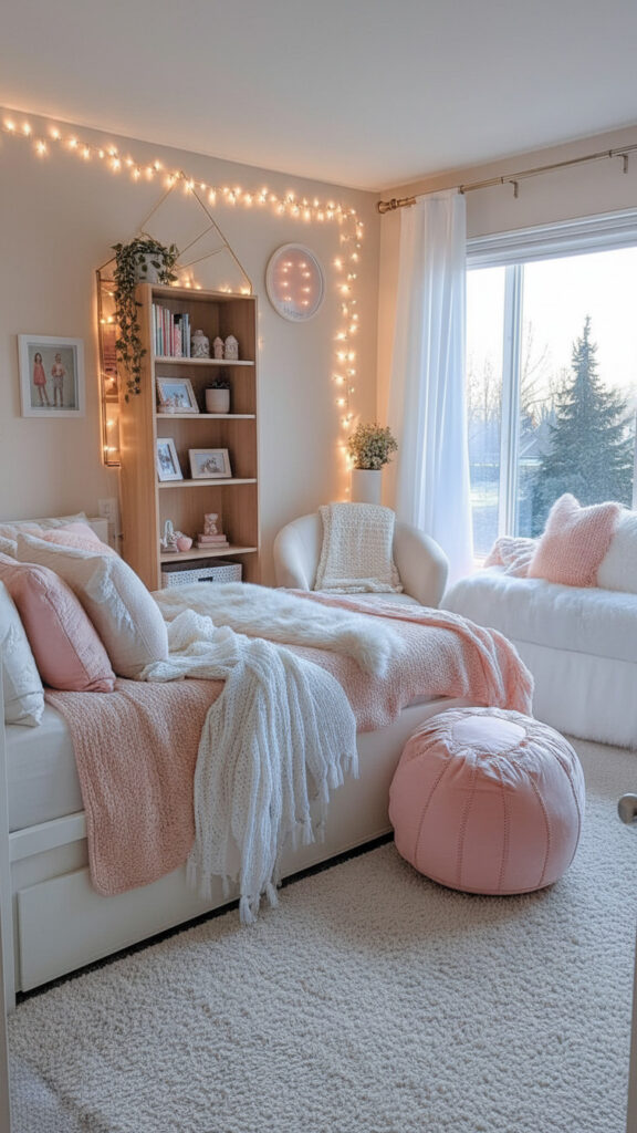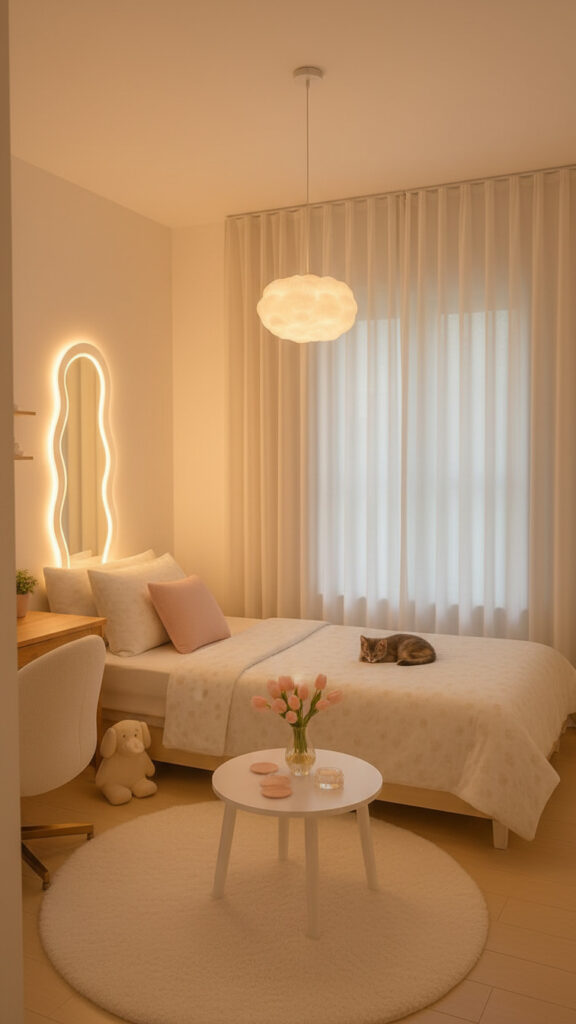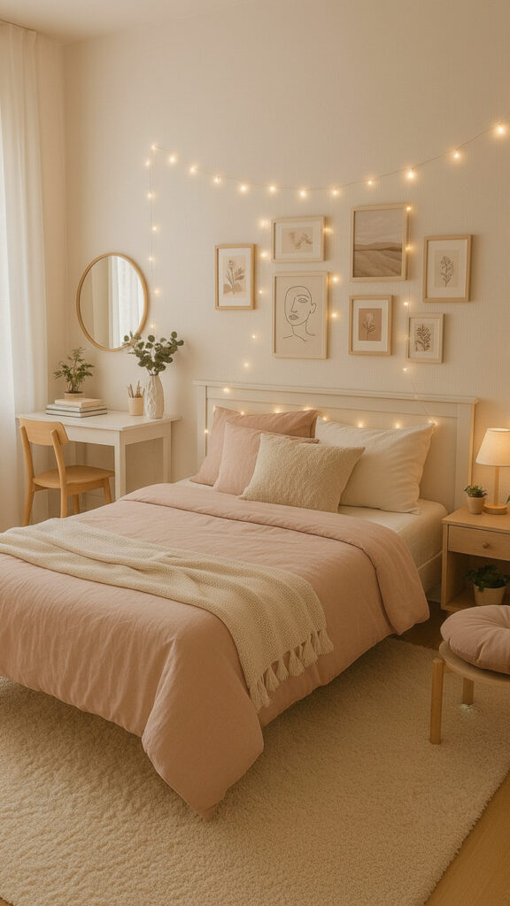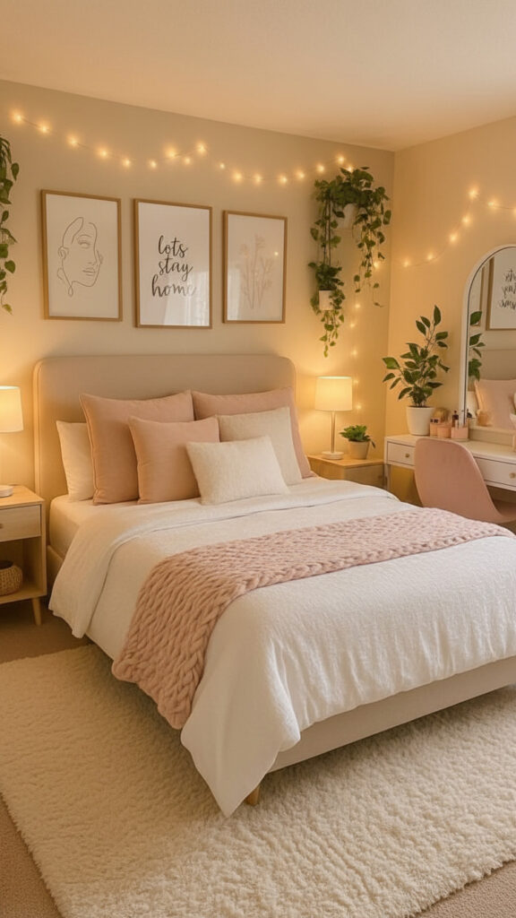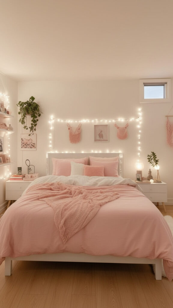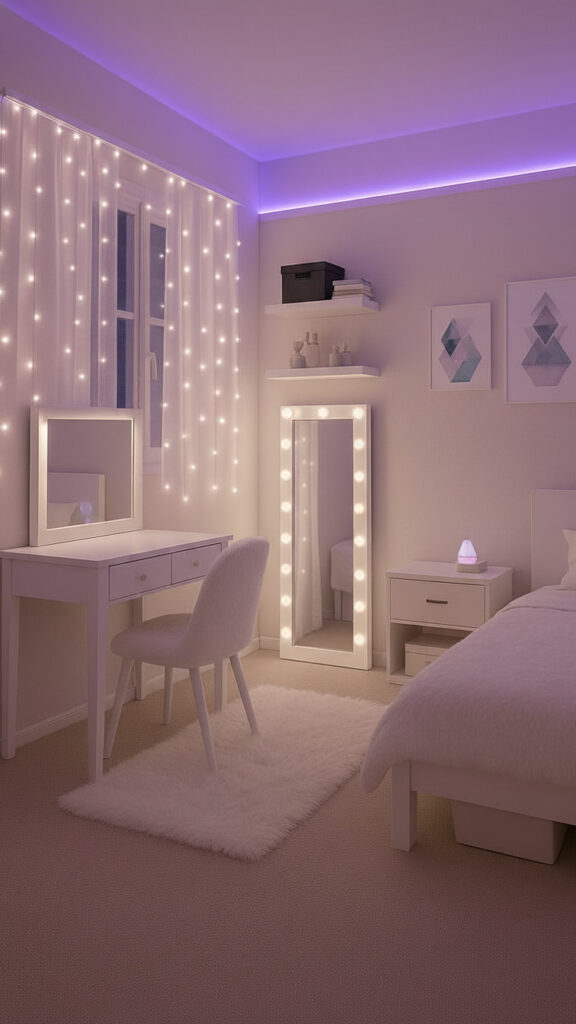 Choose warm white bulbs for a cozy feel. For a fun twist, use color-changing LEDs. This is one of the most affordable cute bedroom ideas.