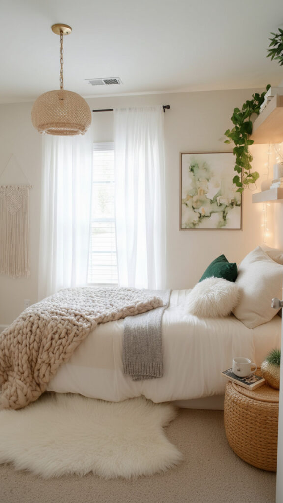 A sheepskin rug beside the bed feels luxurious. It is the first thing your feet touch in the morning. Larger shag rugs work well in the center.