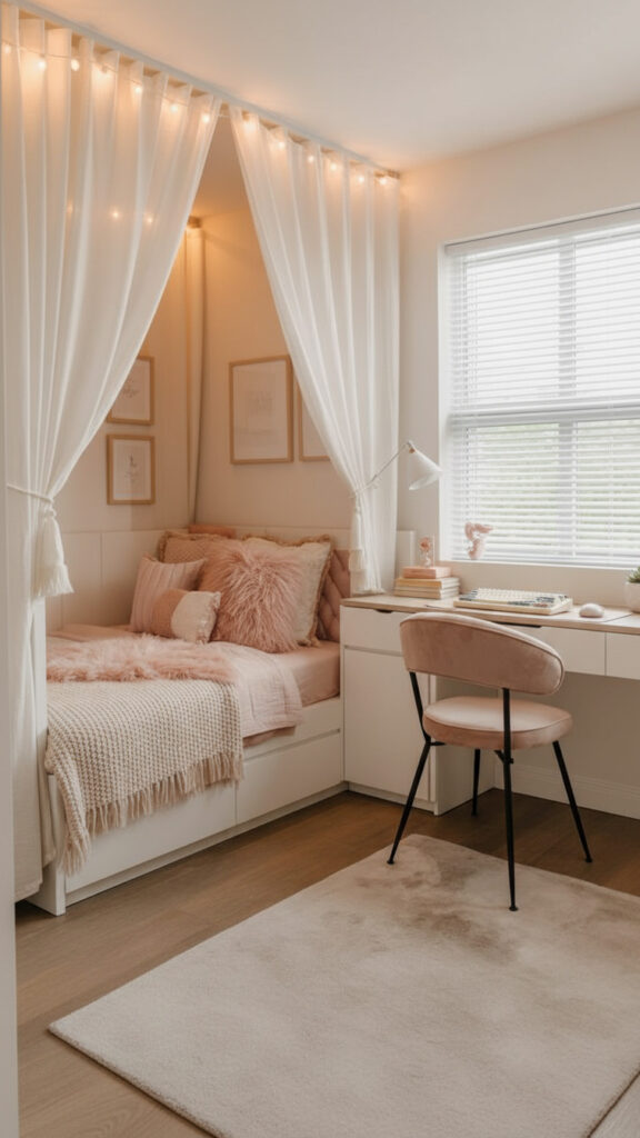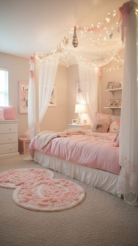 Nothing says “dreamy” like a canopy bed. It creates a cozy, enclosed feeling for sleeping. You do not need a four-poster bed.