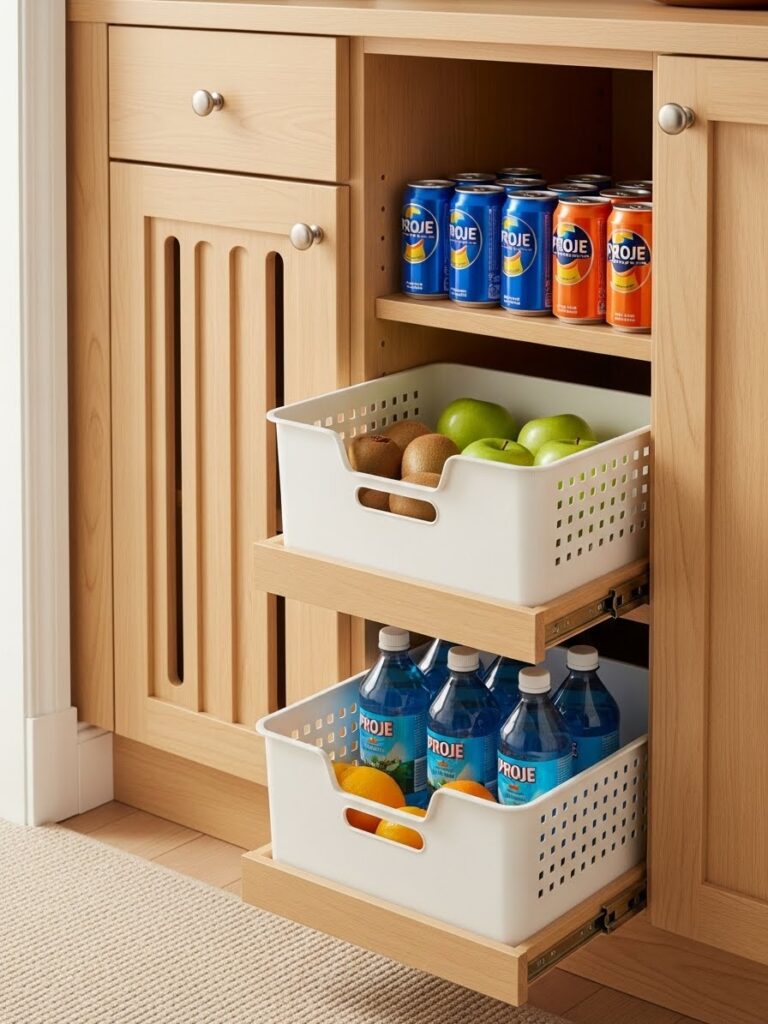 A Refrigerator soda can dispenser keeps beverages neat and accessible. Use clear plastic bins to group items like condiments.