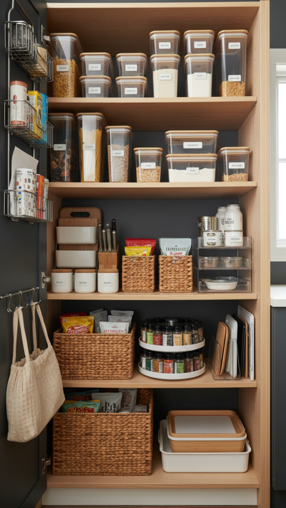 Visual noise from mismatched cardboard boxes makes a pantry feel cluttered and messy. Removing original packaging is a quick win for aesthetics and freshness.