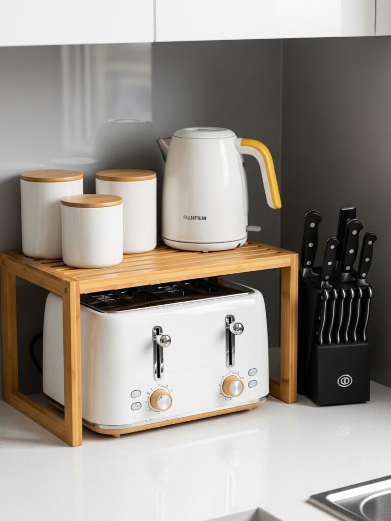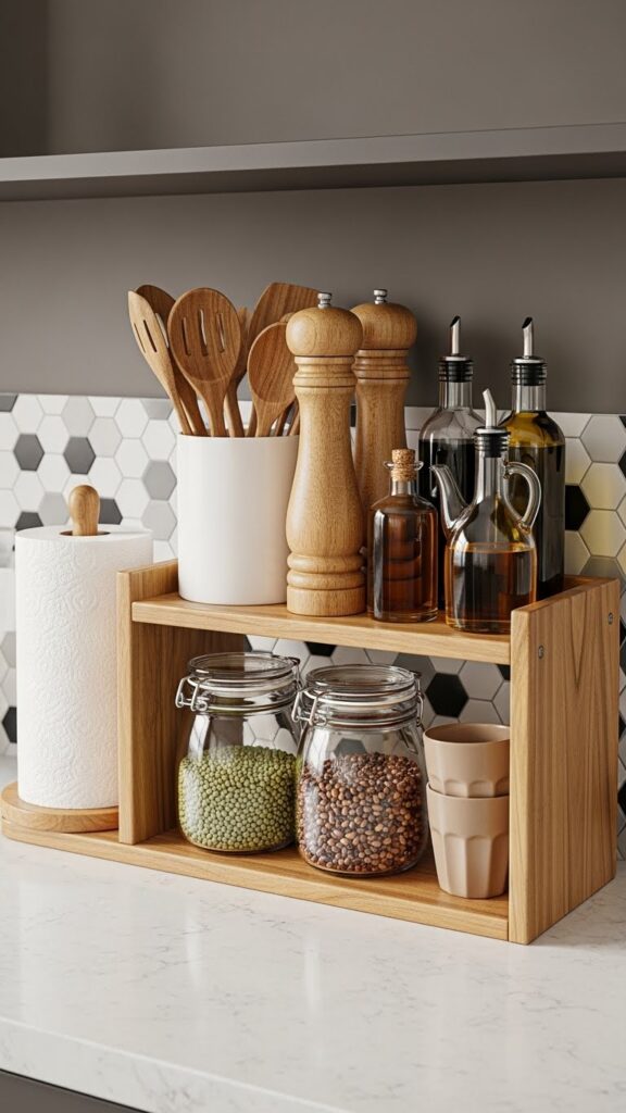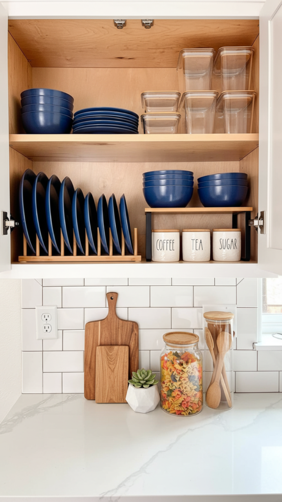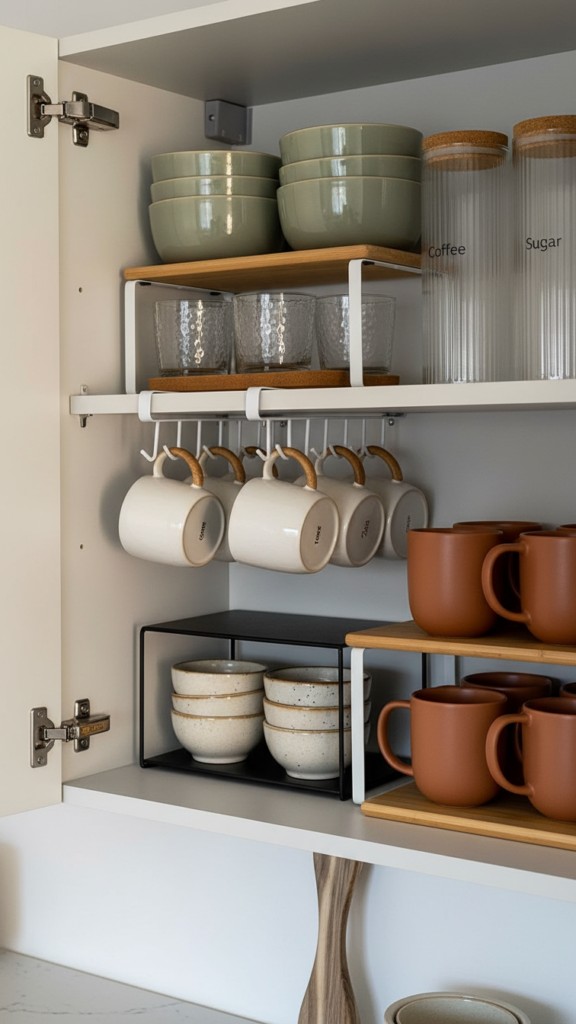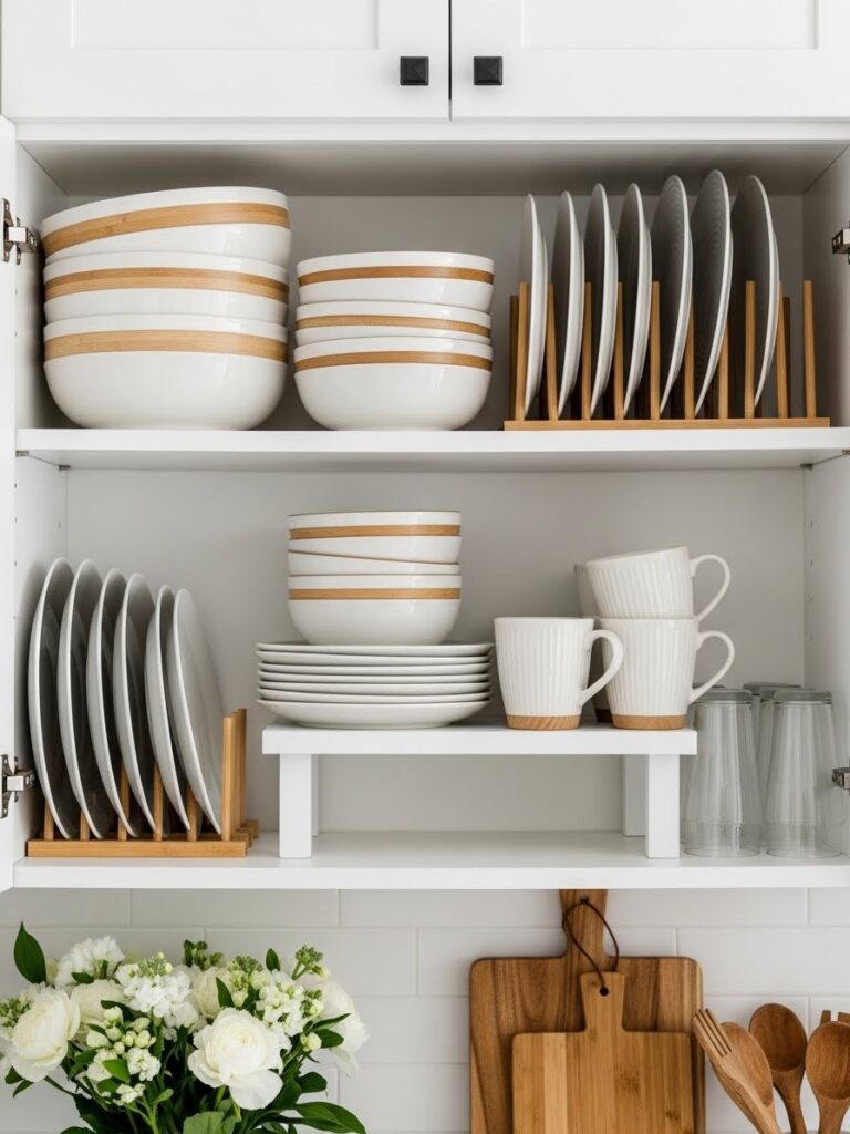 Use Bamboo stackable shelf risers to create a second tier for dishes. This simple addition instantly doubles your storage capacity without renovation.