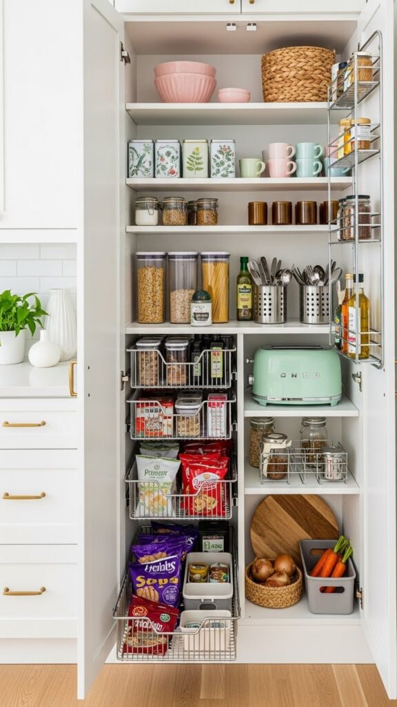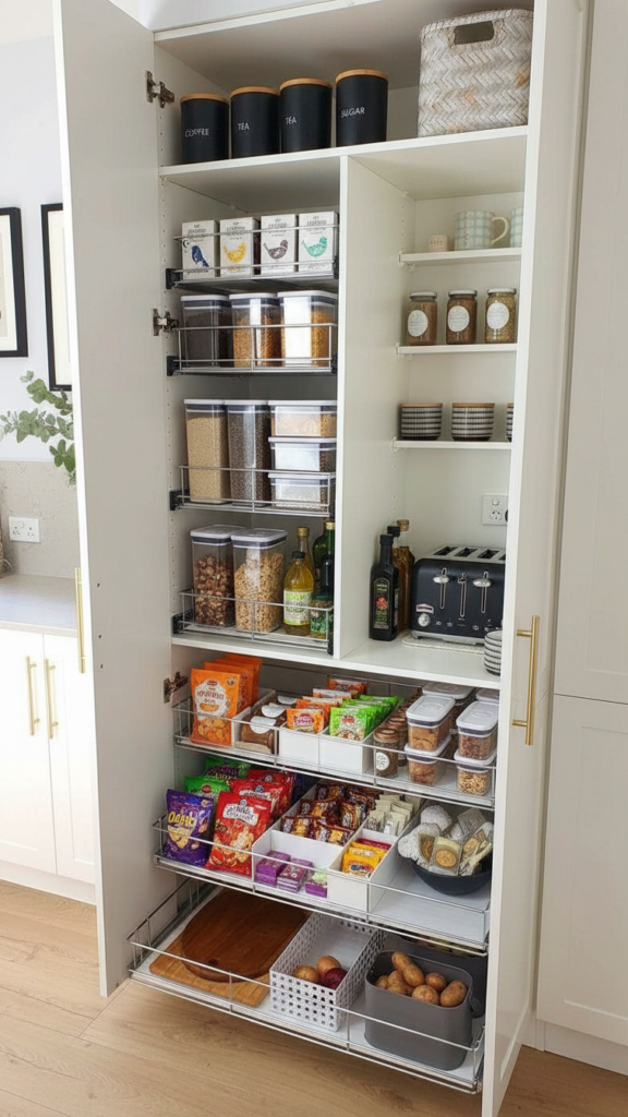 Kids often destroy a tidy pantry while hunting for their afternoon treats. Loose wrappers and half-open boxes create an instant mess.