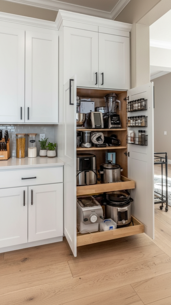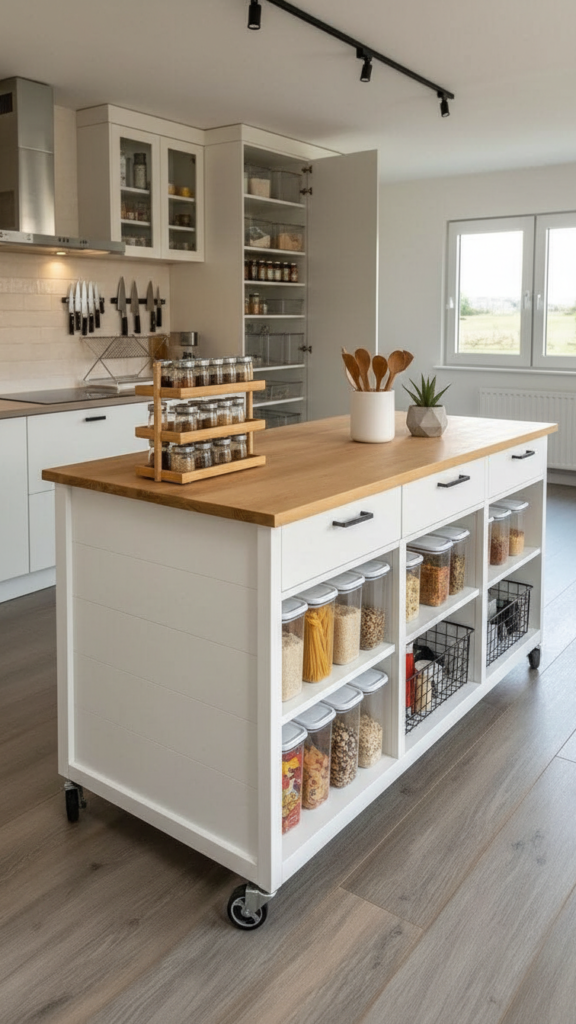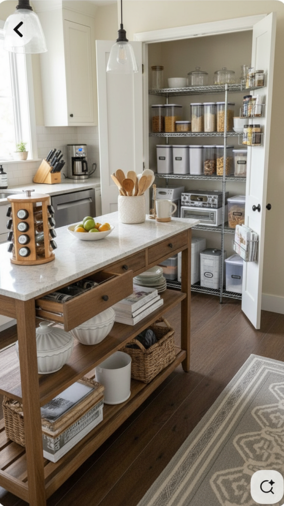 A slim rolling cart can slide into narrow gaps between appliances. It provides instant shelves for pantry items or cleaning supplies.
