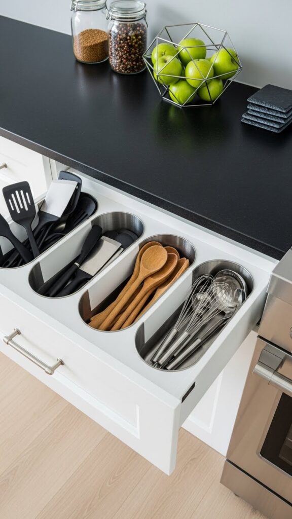 Use an Expandable cutlery drawer organizer to give every utensil its own compartment. This prevents tools from sliding around every time you open the drawer.