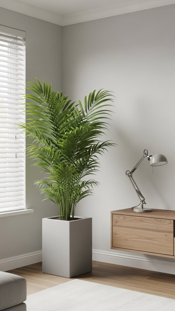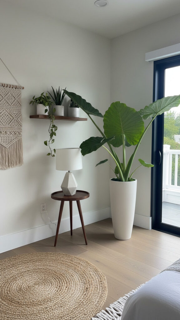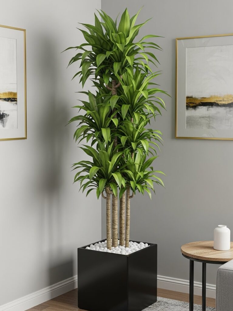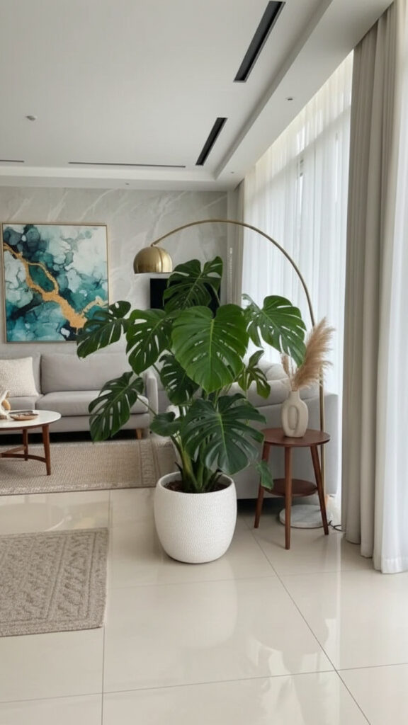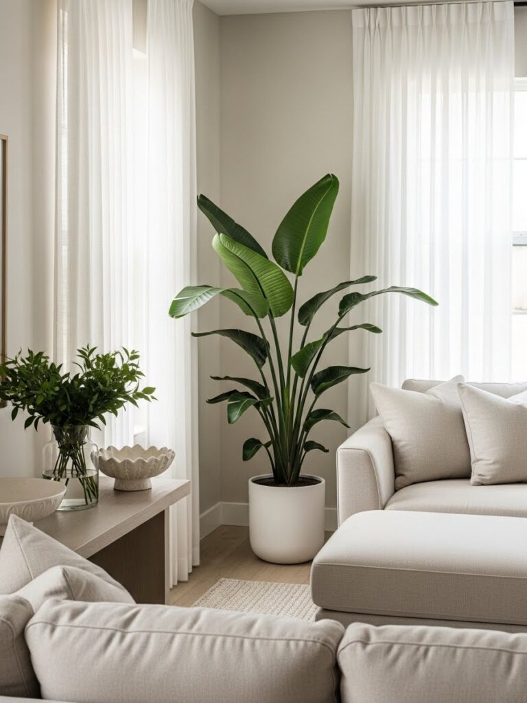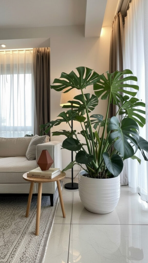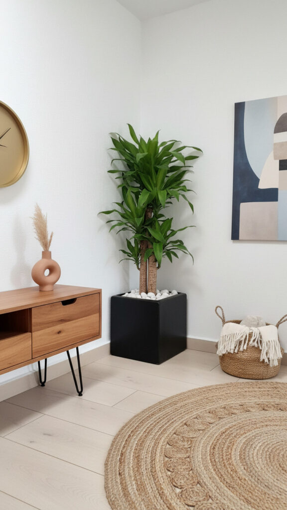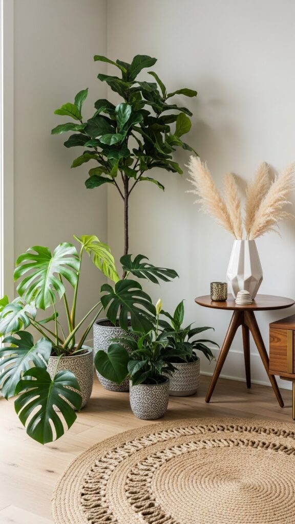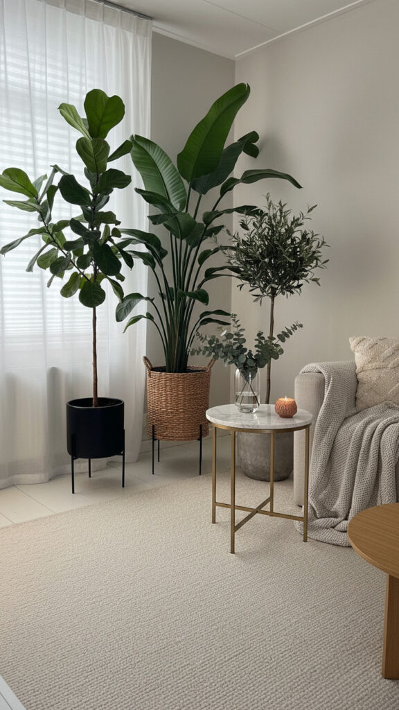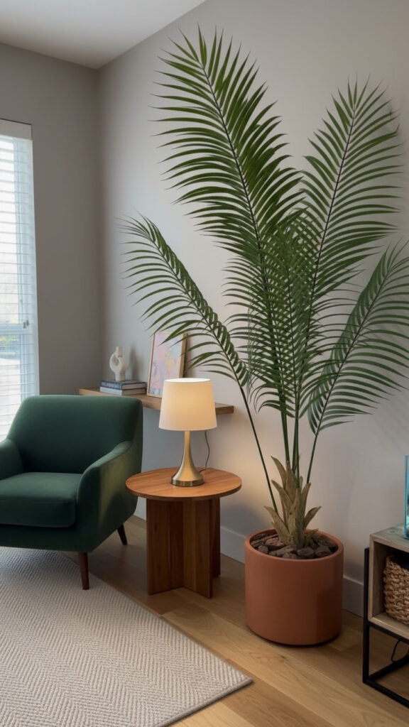 A tall plant draws the eye upward. It makes a room feel taller. It fills the “dead space” in corners that furniture cannot fill.