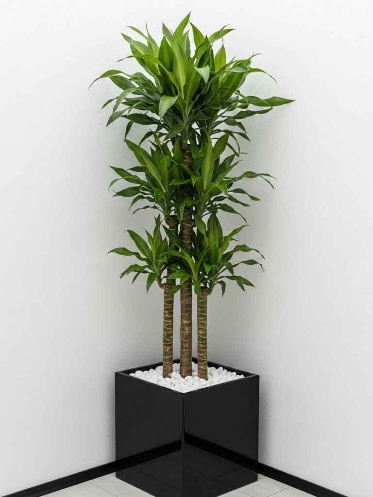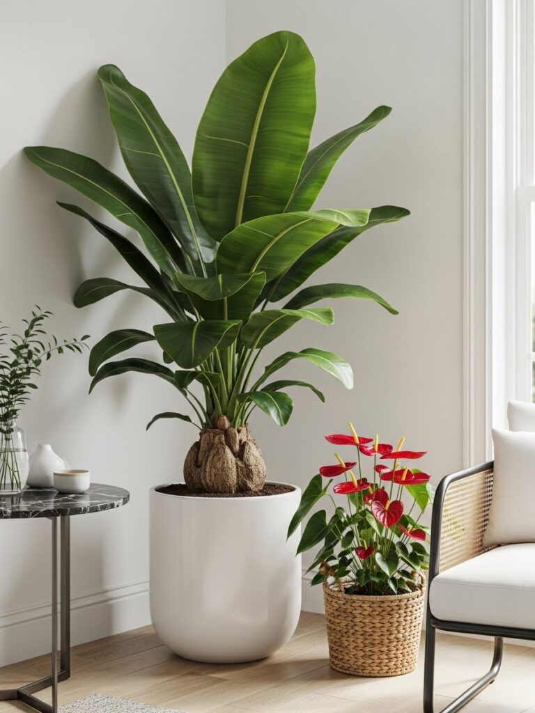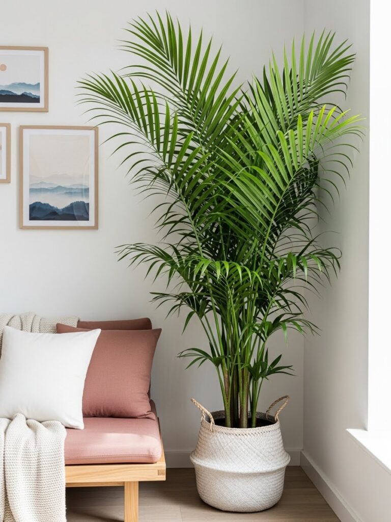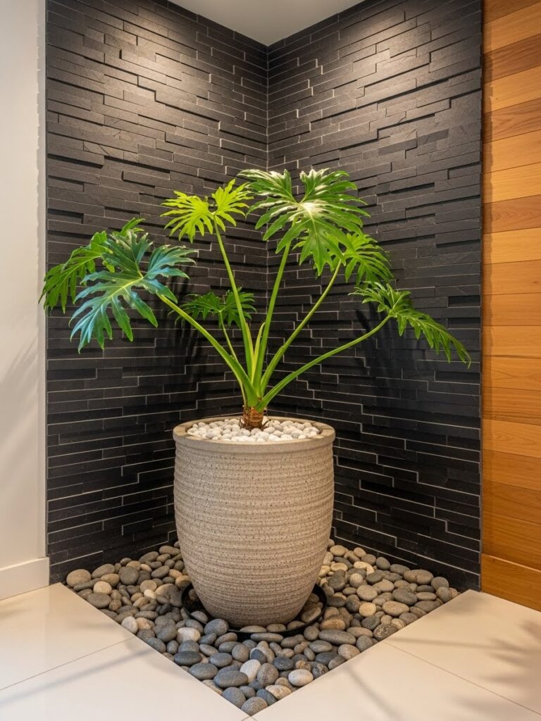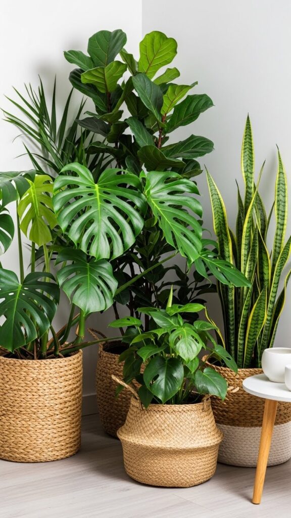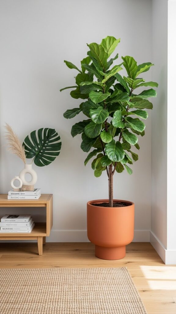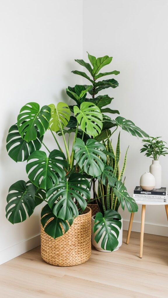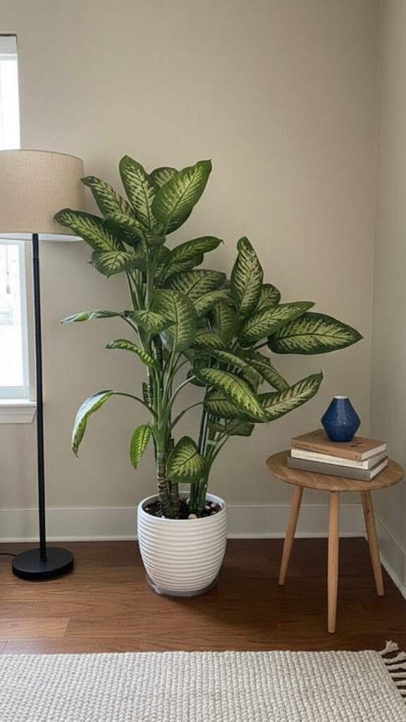 A tall plant draws the eye upward. It makes a room feel taller. It fills the “dead space” in corners that furniture cannot fill.