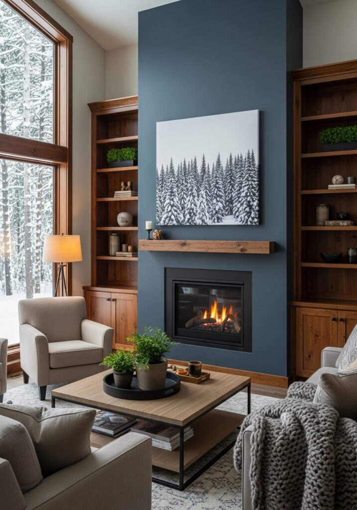 You can also use the fireplace to add a pop of color. A blue-bordered fireplace can tie into nearby artwork. This creates a cohesive and well-planned design. It shows great attention to all the details.