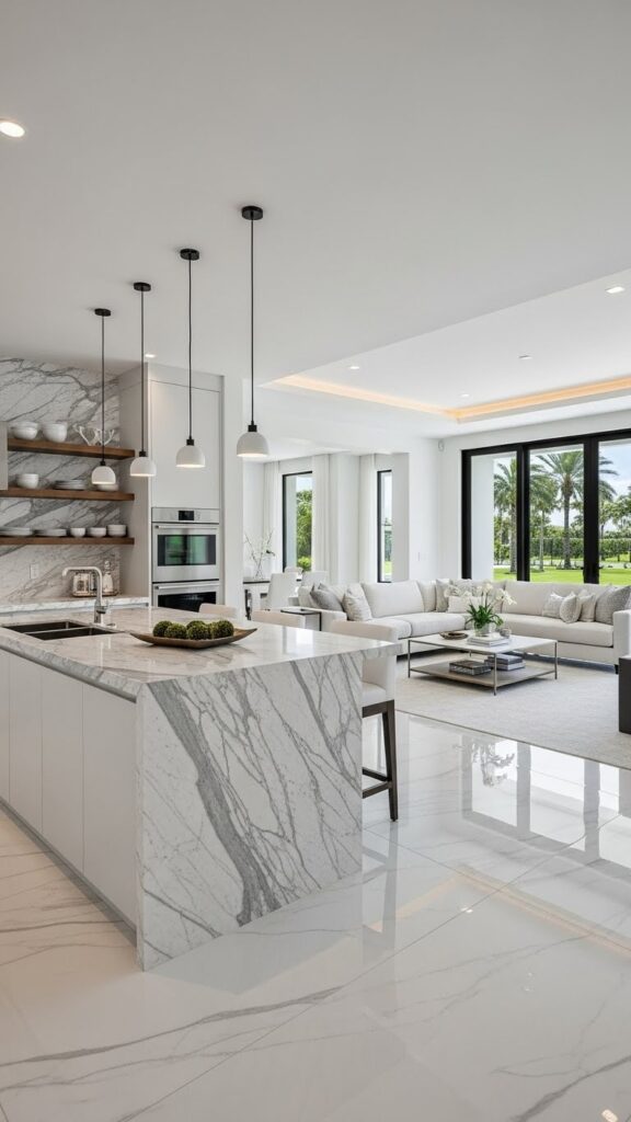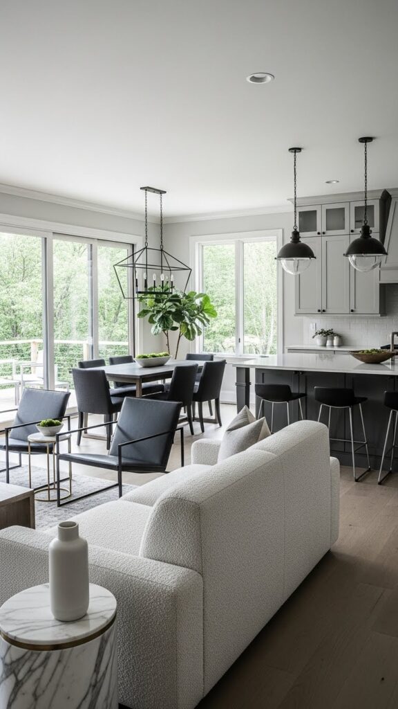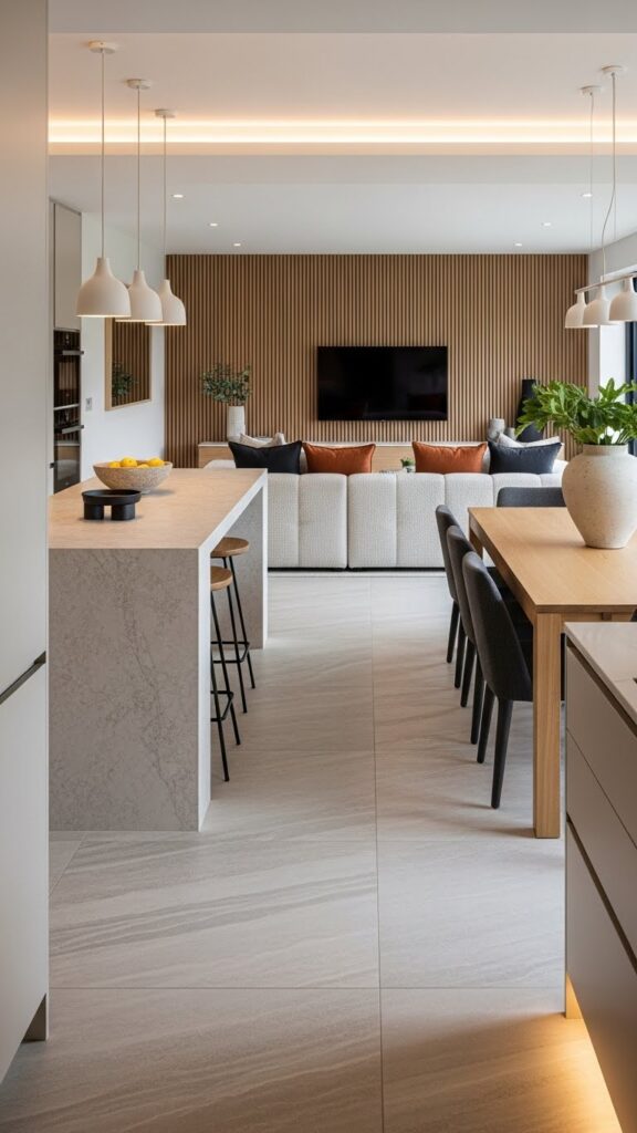 This seamless transition makes the entire area feel huge. It eliminates visual breaks on the floor. It creates a true open floor plan.