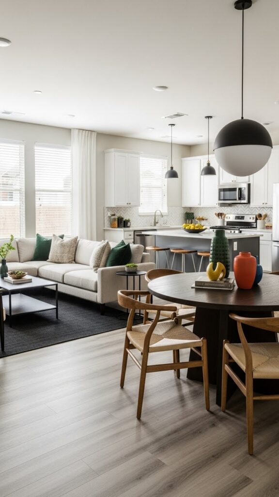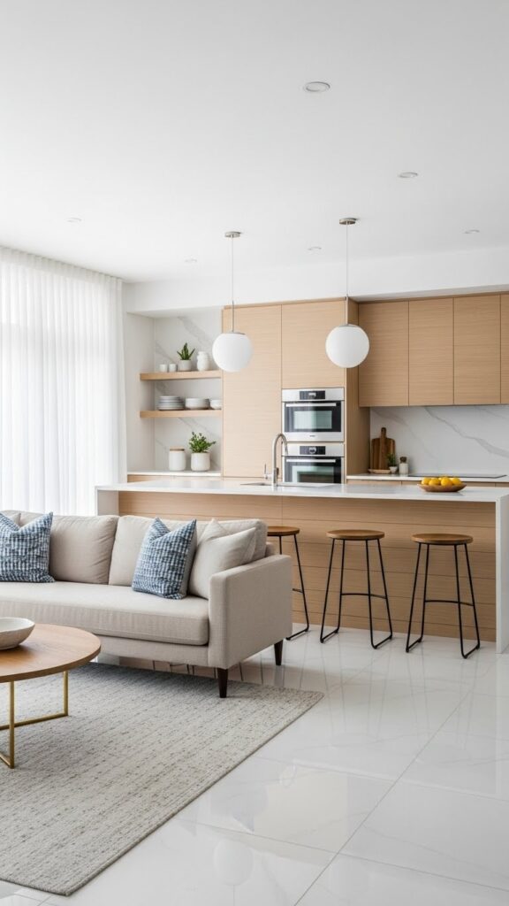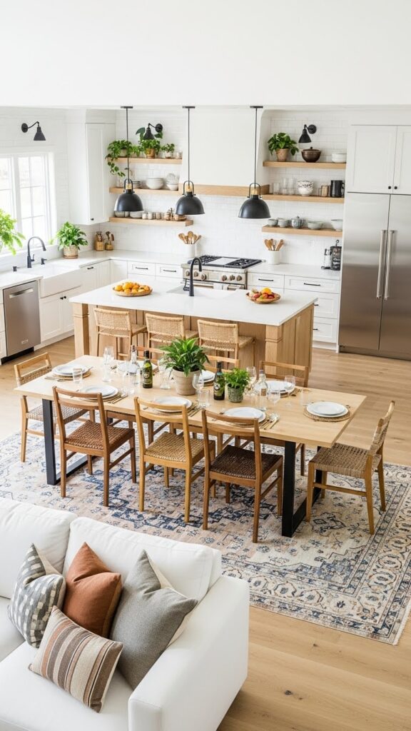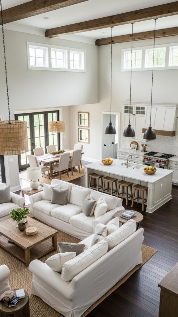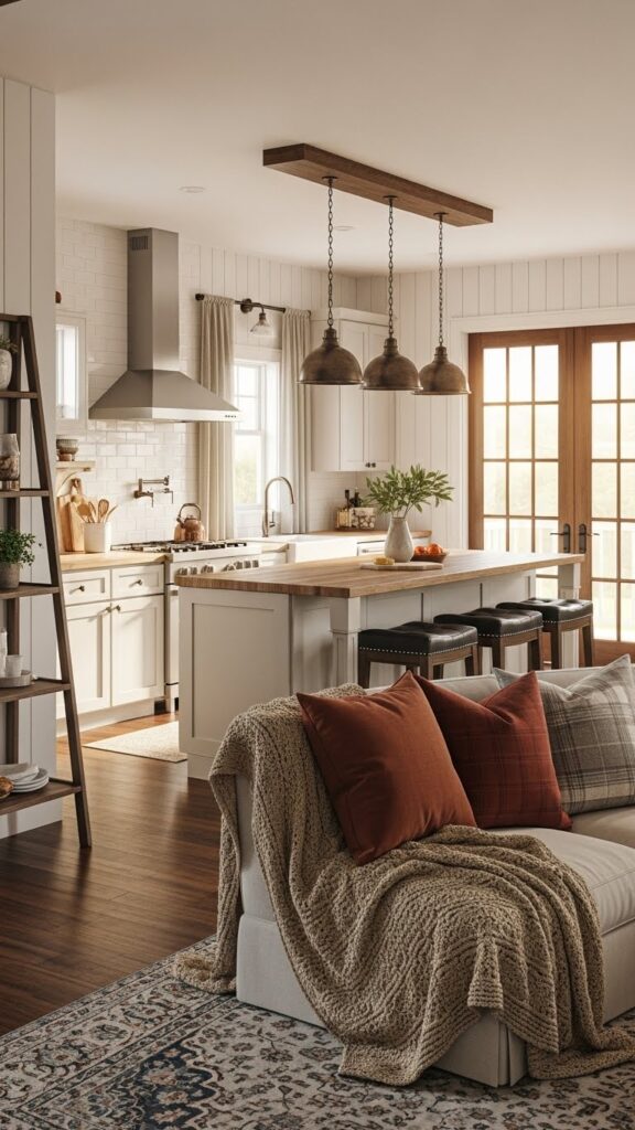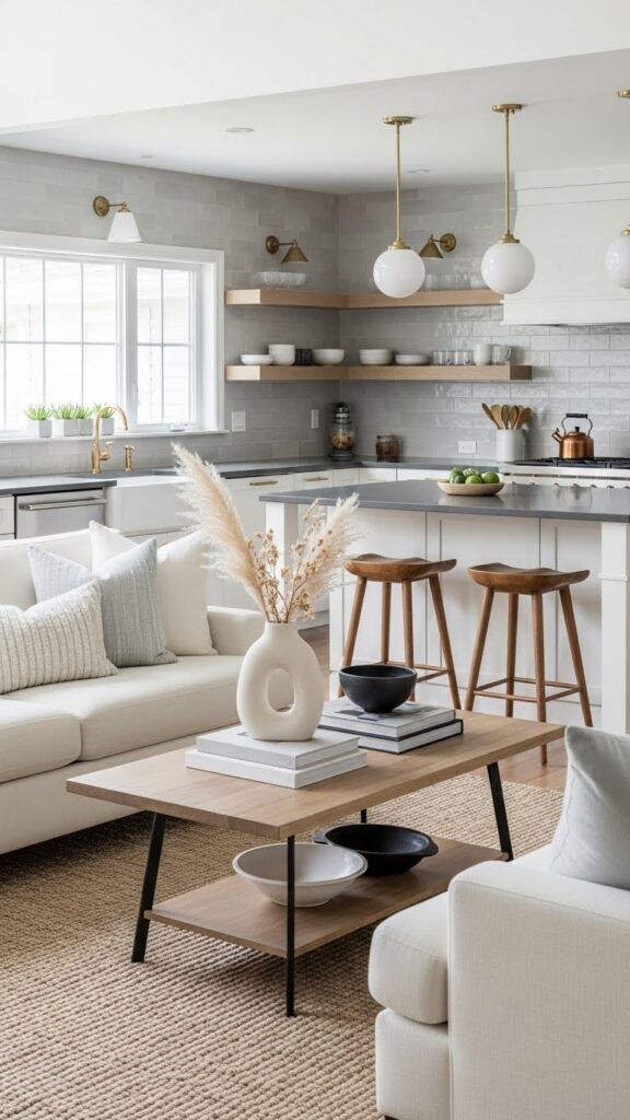 Use warm whites and natural woods. Add vintage accessories for charm. It makes the open space feel like home.