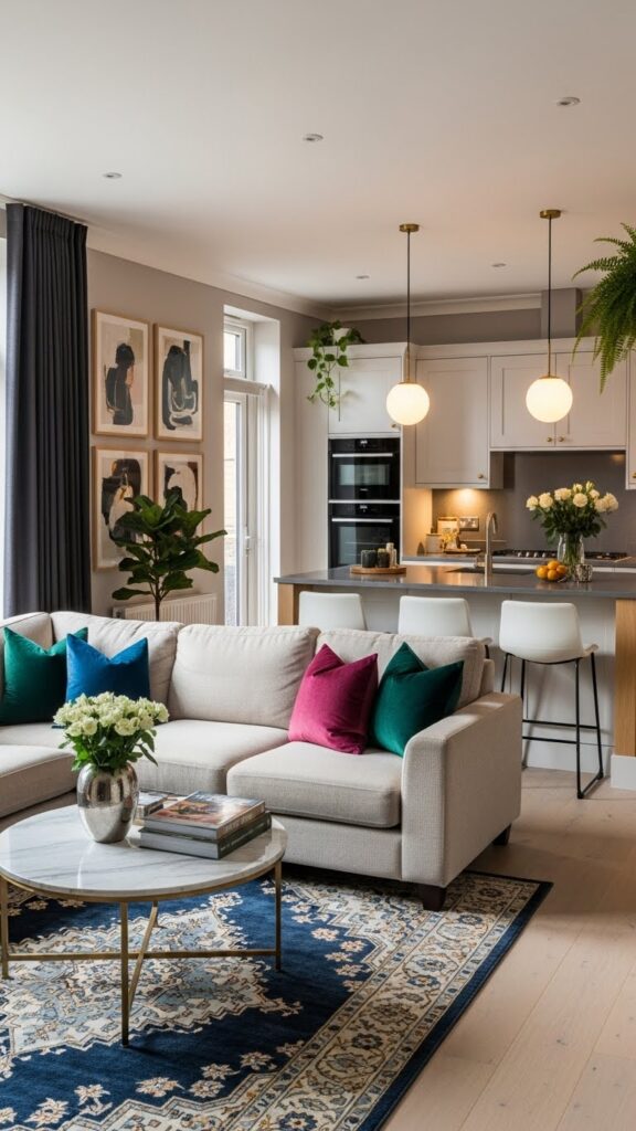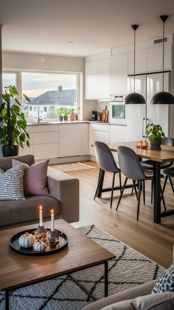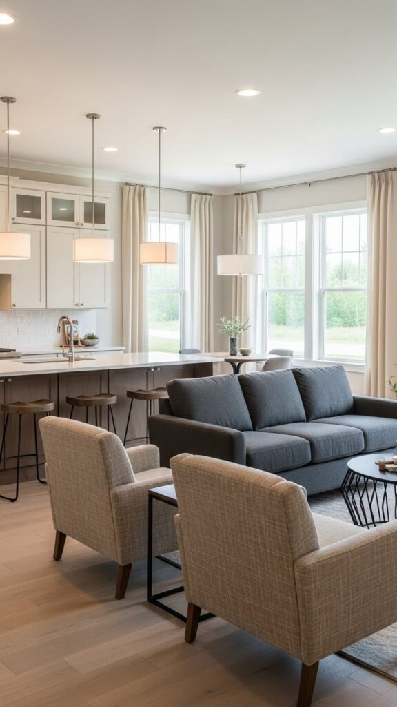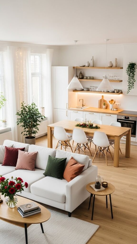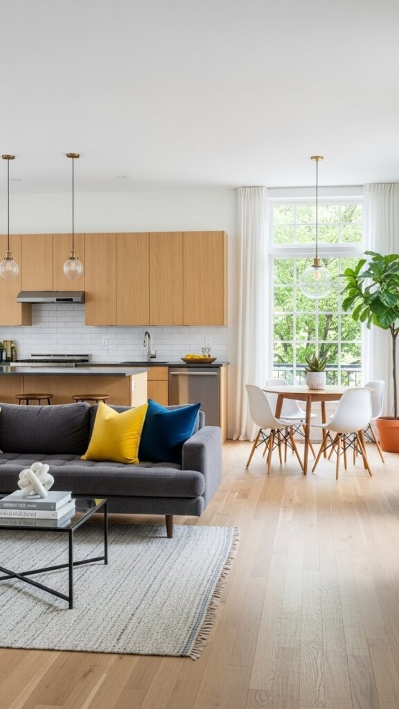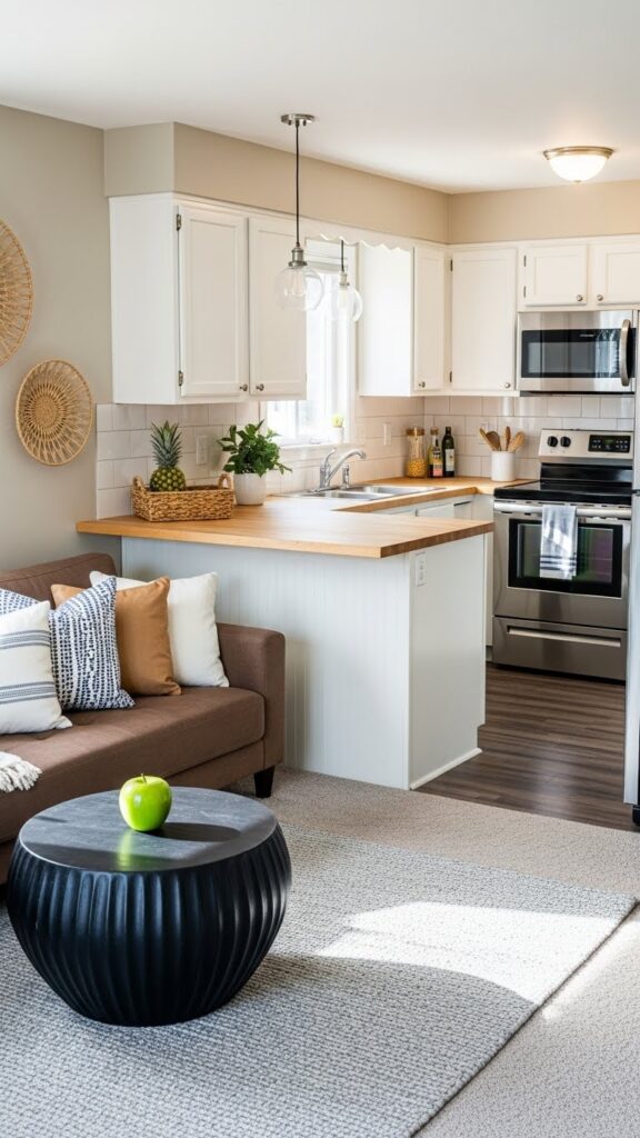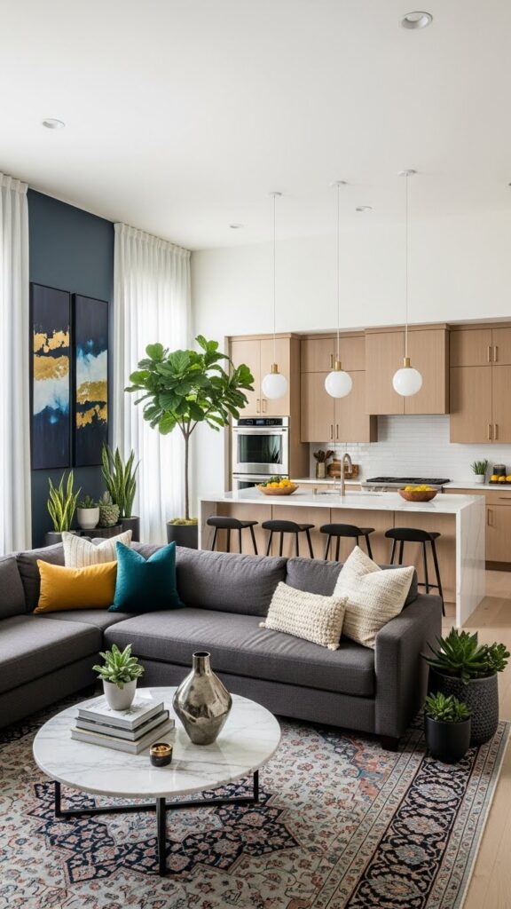 Use warm whites and natural woods. Add vintage accessories for charm. It makes the open space feel like home.