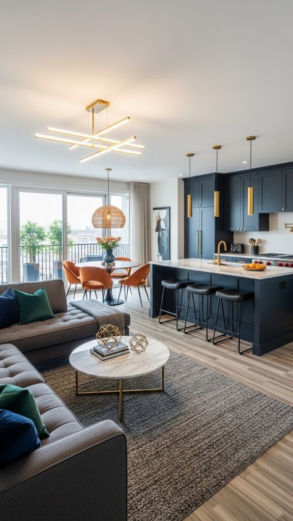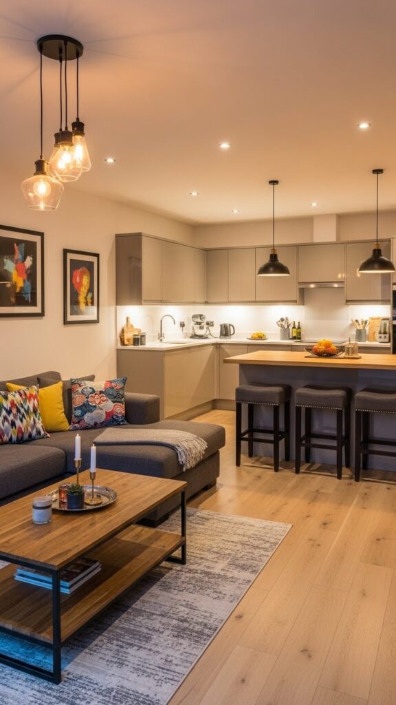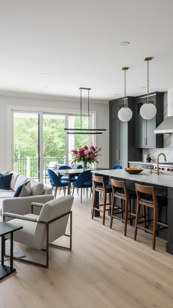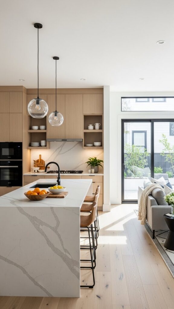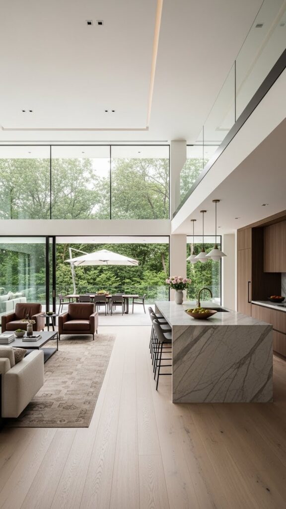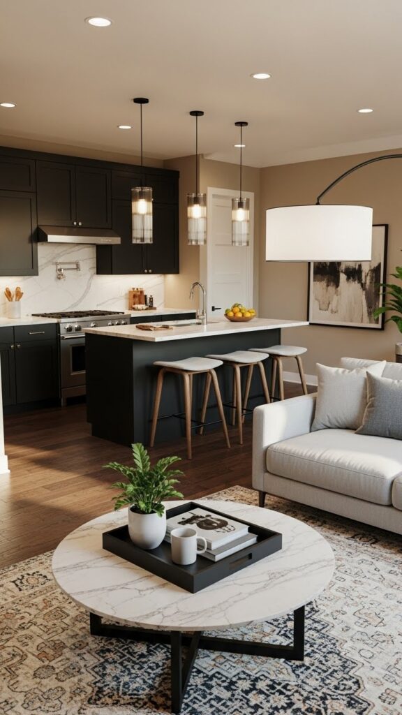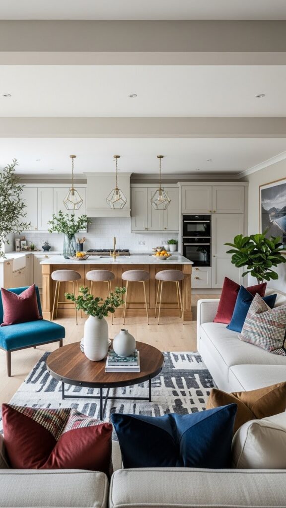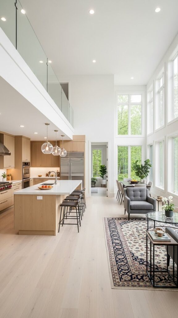 This draws the eye upward. It makes the room feel grander. It connects the kitchen and living zones vertically.