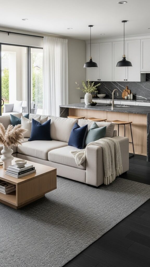 This creates separation without blocking light. It directs traffic flow around the seating area. It makes the room feel structured.