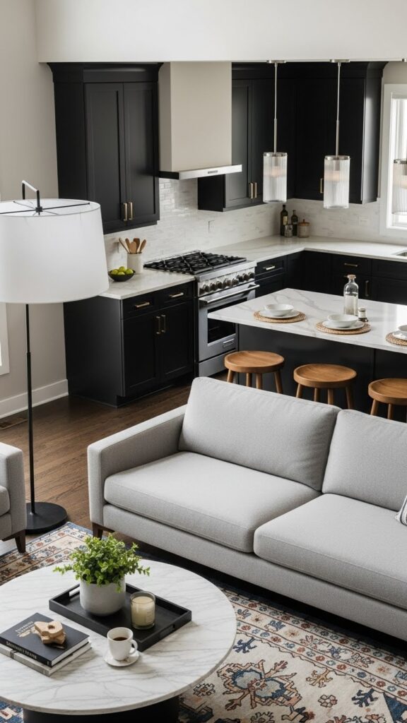 A monochrome palette is chic and simple. Stick to black, white, and grey. This unifies the kitchen and living areas.