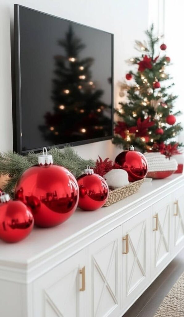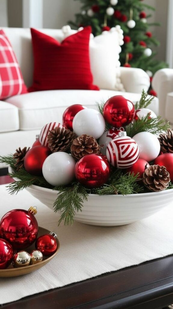You do not need to hang every ornament on a tree. A curated bowl of ornaments makes a stunning centerpiece. This is one of the easiest simple Christmas decor ideas.