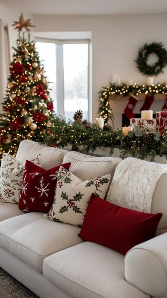 Make your home feel like a warm hug. Swap out your everyday pillows for festive ones. Look for textures like boucle, velvet, or faux fur.