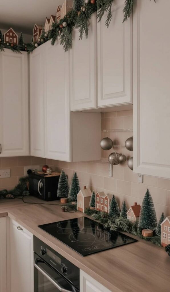 Hang a small wreath on the kitchen window. Tie a small bunch of greenery to the cabinet doors. Swap your tea towel for a holiday-themed one.
