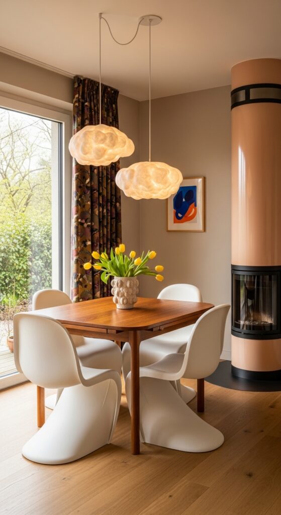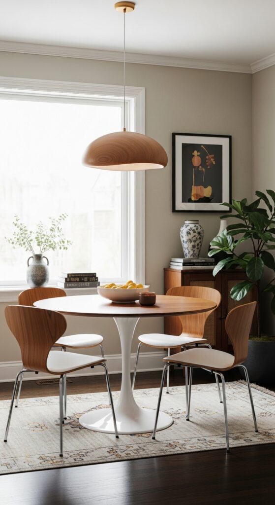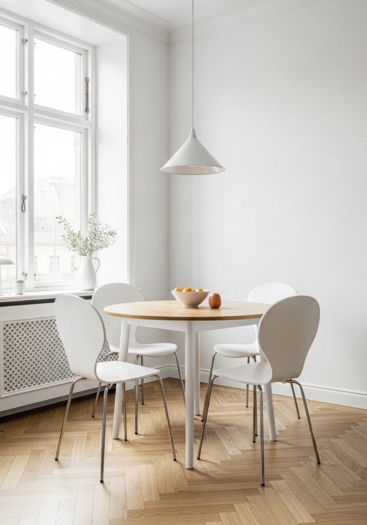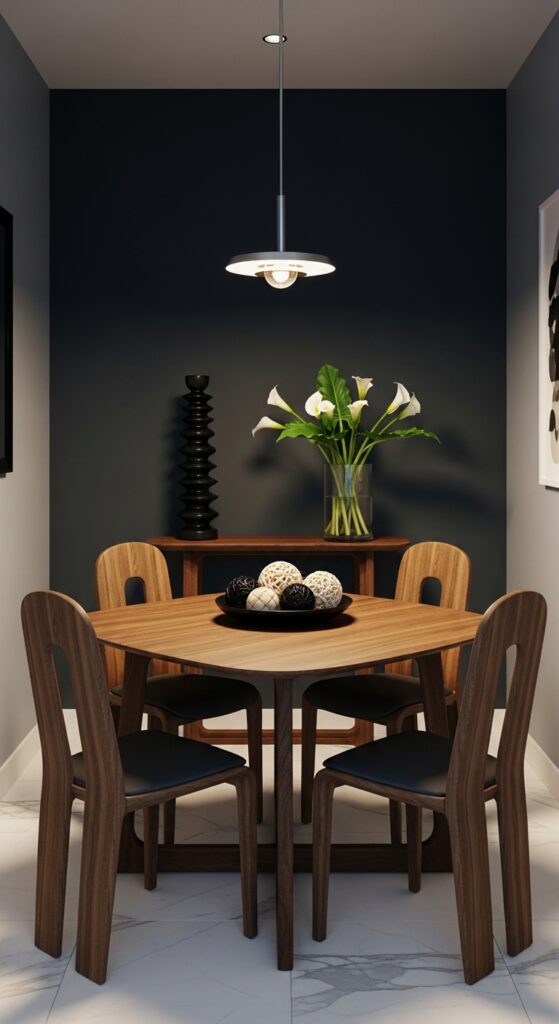 A matched furniture set can feel heavy and catalog-like in a tiny room. Blend vintage wooden chairs with a space-saving Drop-Leaf Wooden Dining Table for contrast. This layered design aesthetic feels curated, relaxed, and highly personal.