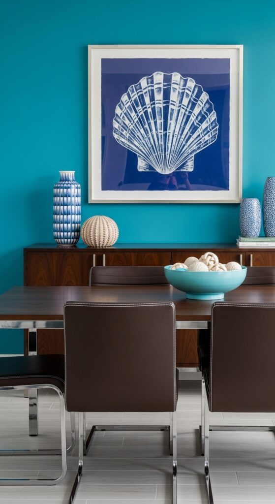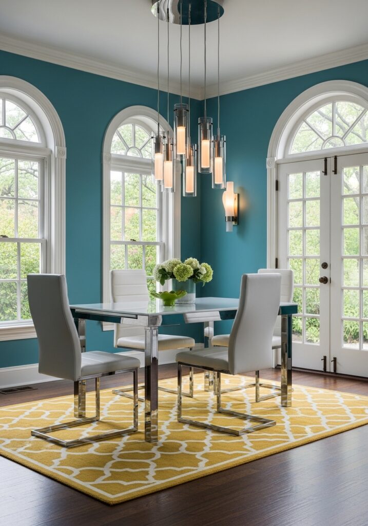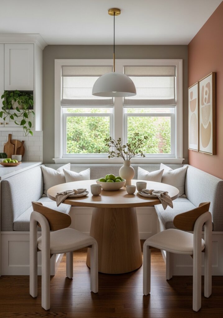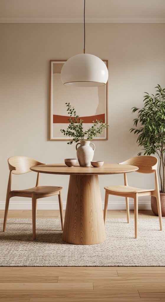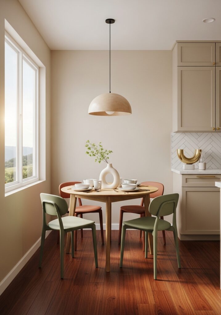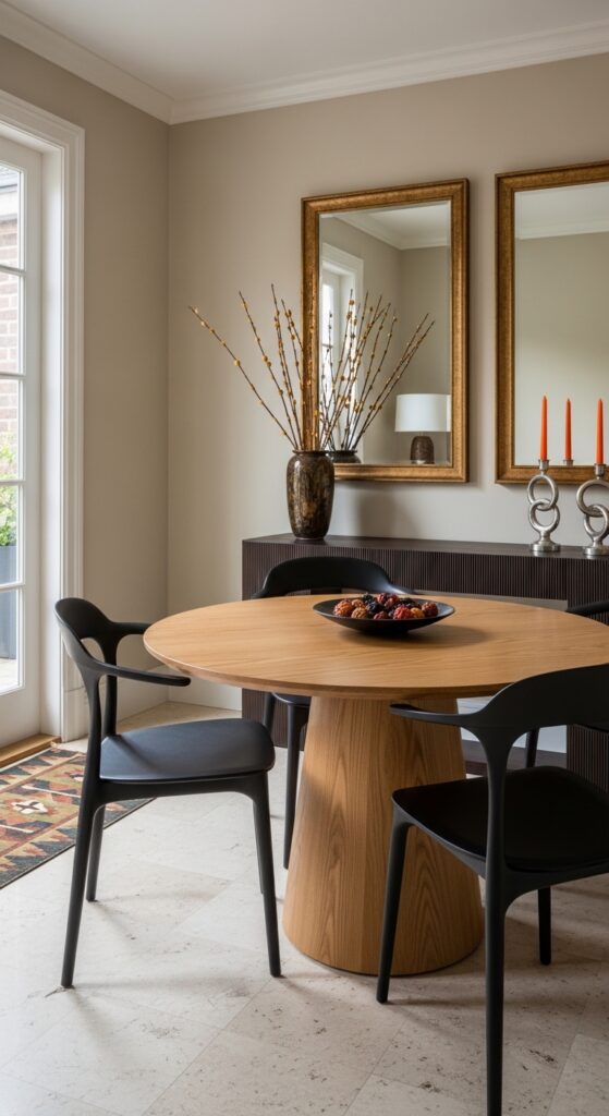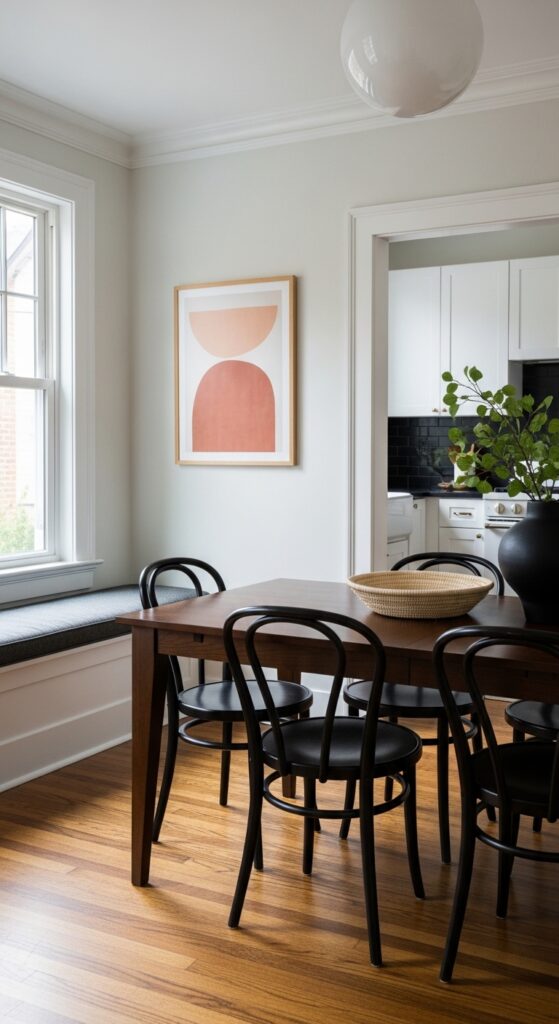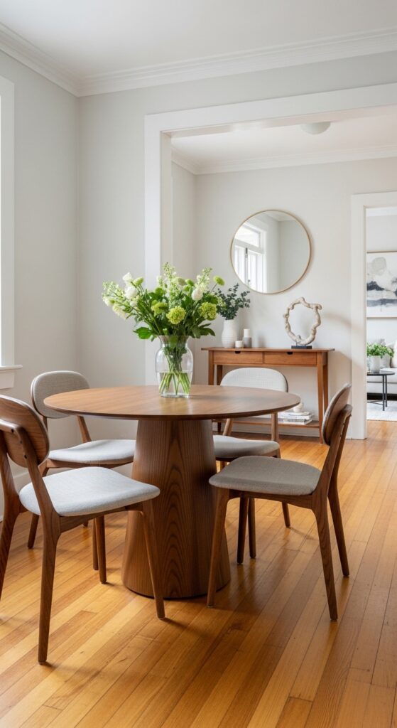If your table sits within an open concept living area, you must define it visually. Paint an arch or a solid color block on the wall behind the table. This visually separates the eating area from the lounging space effortlessly.
