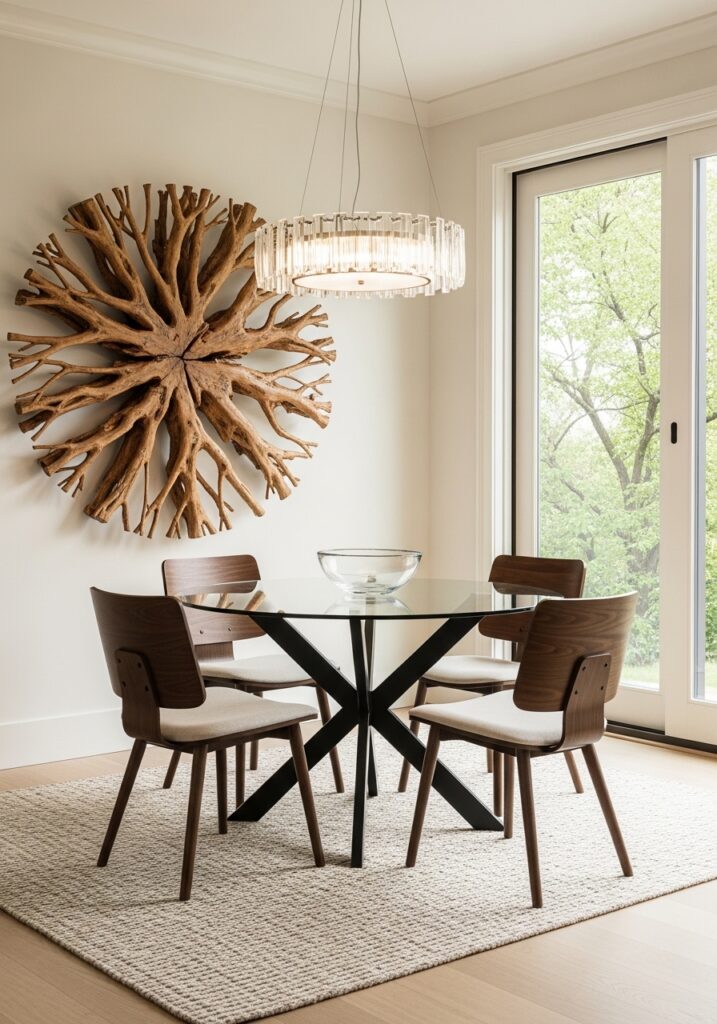 Draw the eye upward with dramatic lighting fixtures suspended over the center of the table. A bold piece, like a Brass Sputnik Chandelier or an Oversized Woven Pendant Light, acts as a stunning focal point that distracts from the limited floor space below. Ensure it hangs about 30 to 36 inches above the tabletop for ideal illumination.
