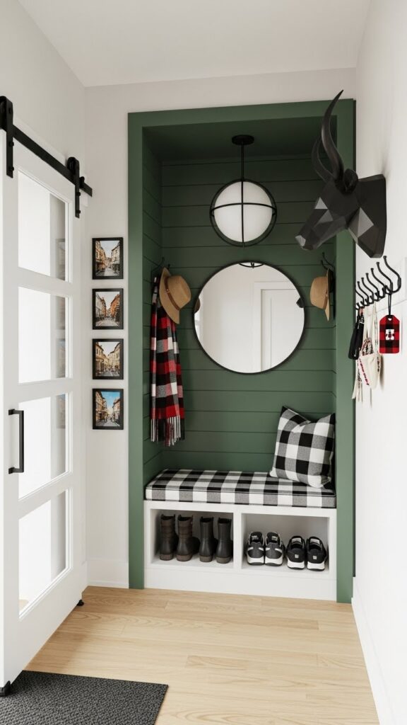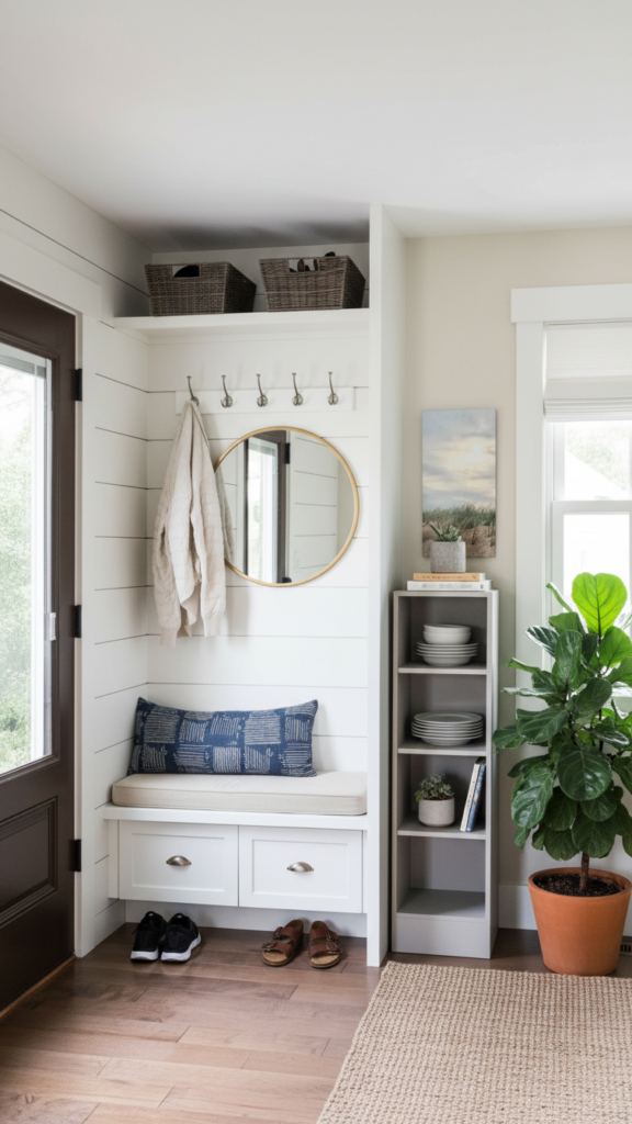 If you canโt expand outward, you must expand upward. Installing vertical shiplap or wood slatting draws the eye up toward the ceiling, emphasizing the height of the room rather than its narrow width. This architectural detailing adds texture and interest without protruding into the physical space. Paint it in a crisp white for a farmhouse look, or a moody charcoal for a modern, dramatic entrance.