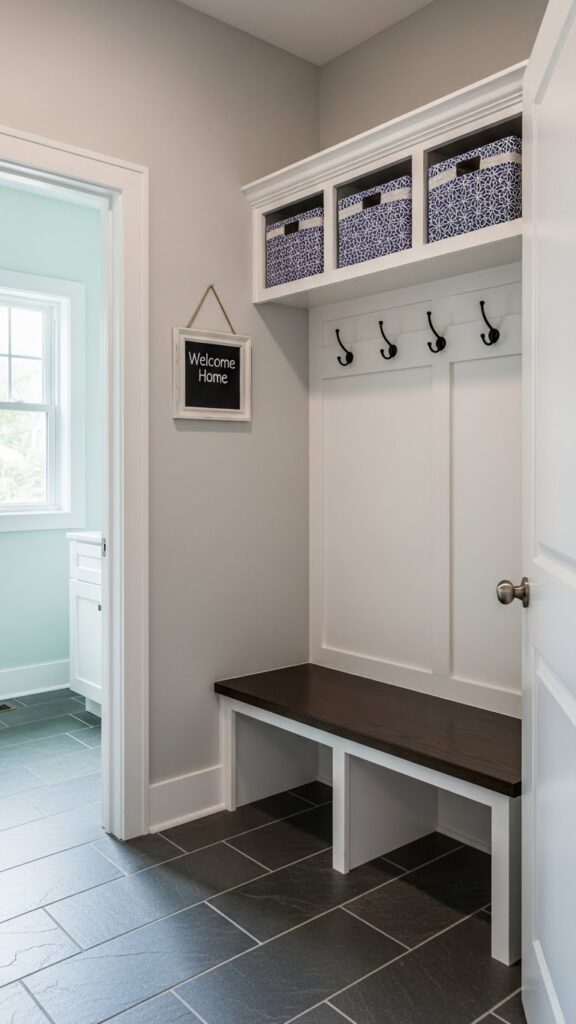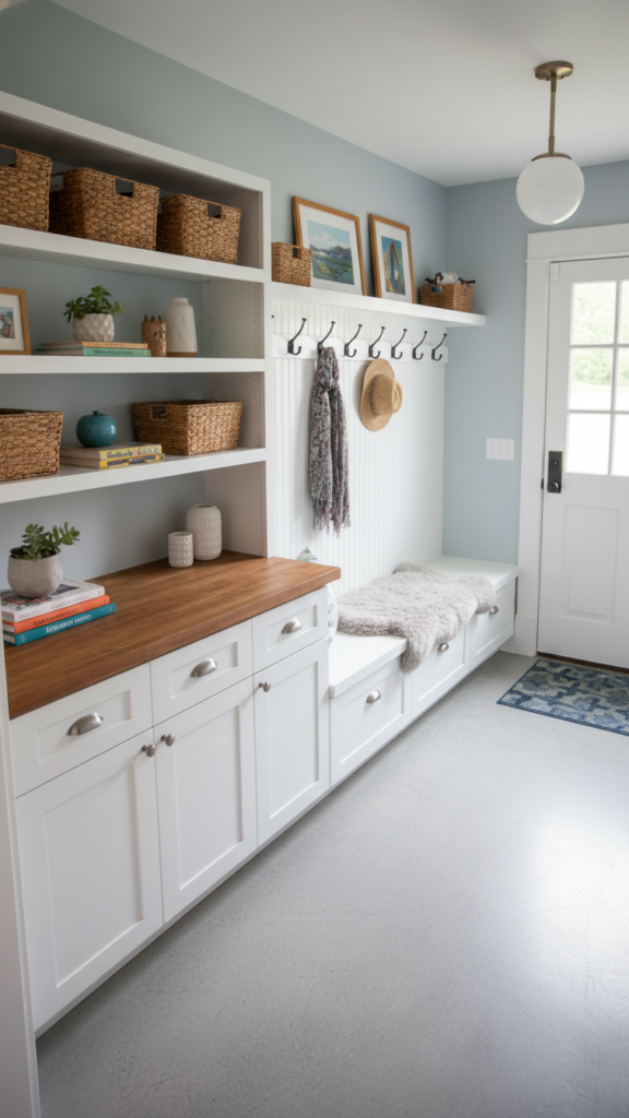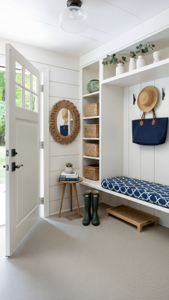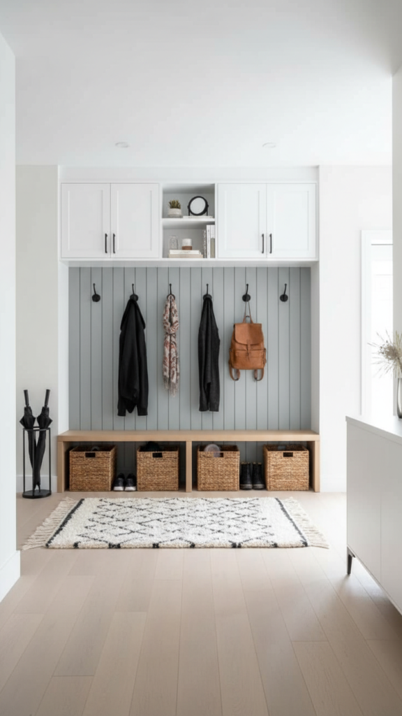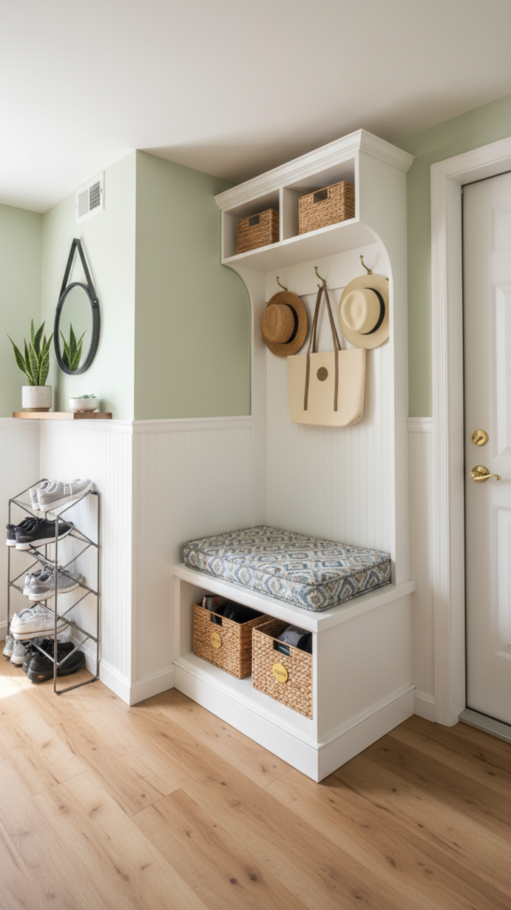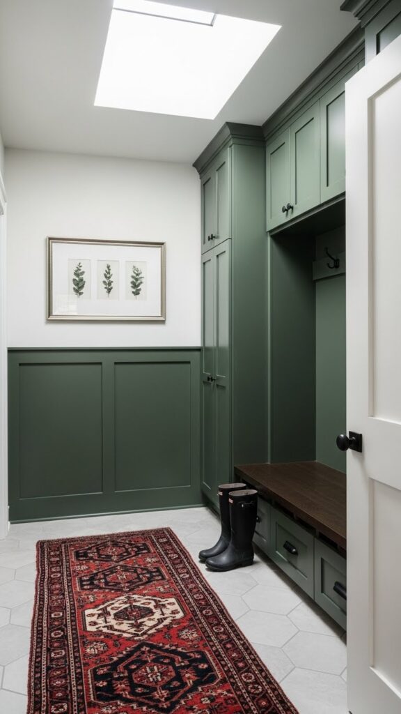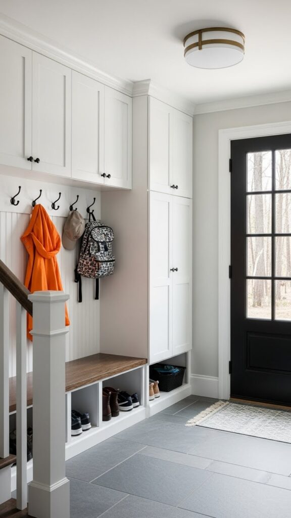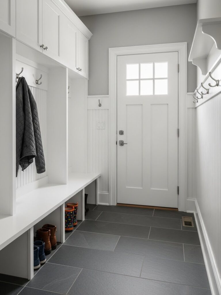 Adding wainscoting or beadboard to the lower half of the wall does two things: it protects the walls from scuffs in a high-traffic area, and it adds architectural depth. Painting the wainscoting a darker color than the upper wall grounds the space, while keeping the upper half light makes the ceiling feel higher.