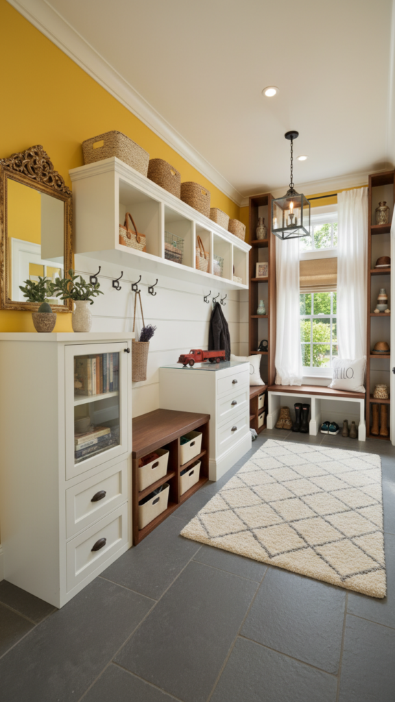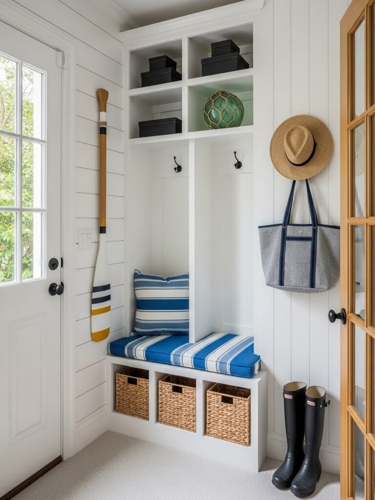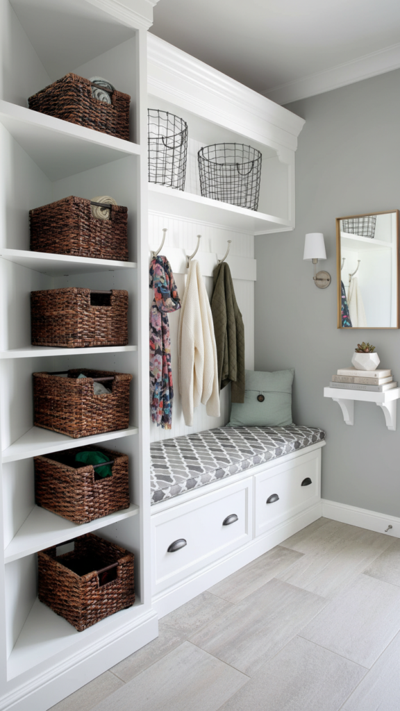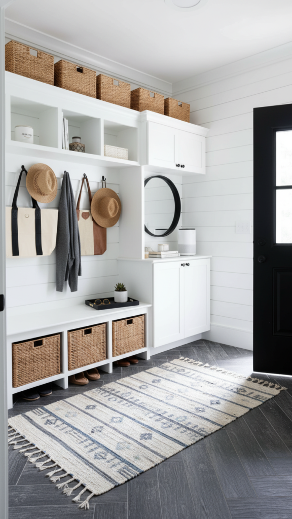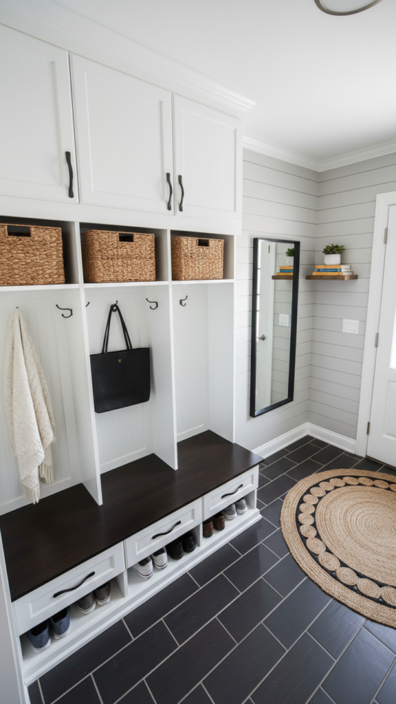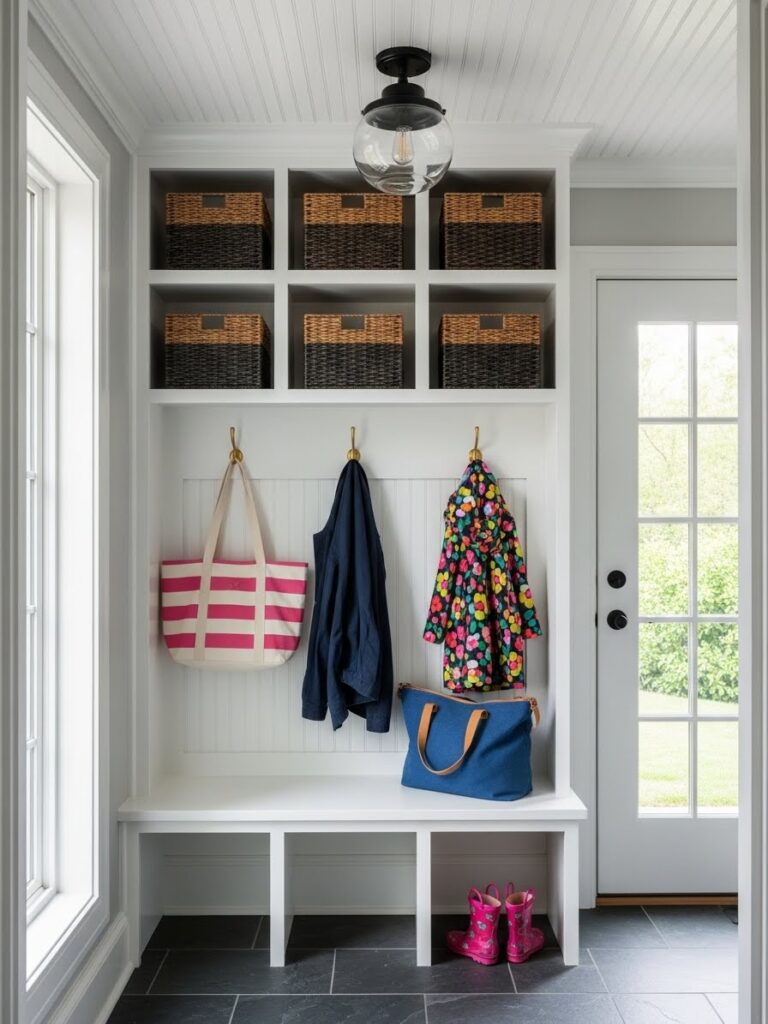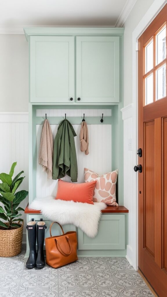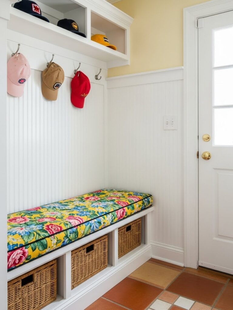Adding wainscoting or beadboard to the lower half of the wall does two things: it protects the walls from scuffs in a high-traffic area, and it adds architectural depth. Painting the wainscoting a darker color than the upper wall grounds the space, while keeping the upper half light makes the ceiling feel higher.