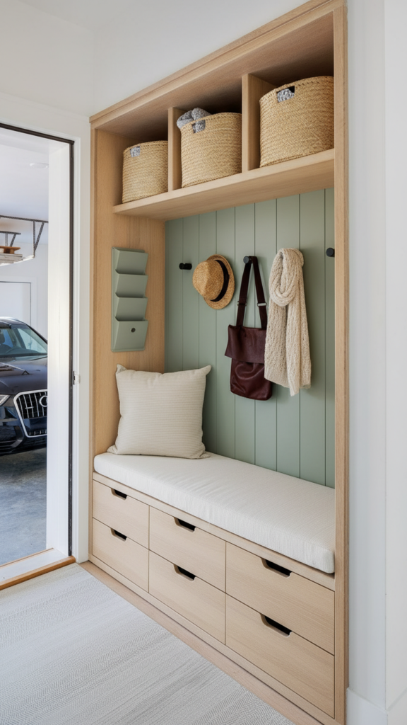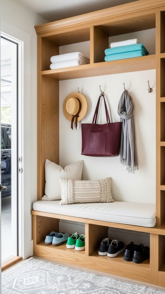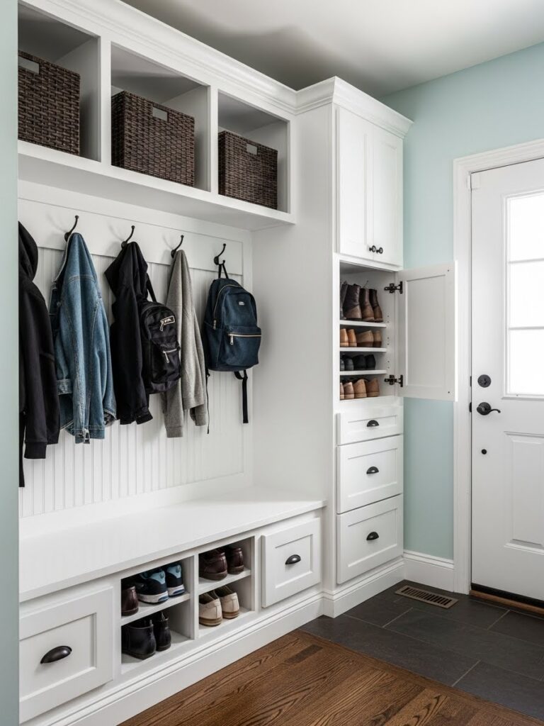 The “pile of shoes” is the enemy of the small entryway. Traditional shoe racks are often bulky and unsightly. The modern solution is the Slim Tip-Out Shoe Cabinet. These units are incredibly shallowโoften only 6 to 10 inches deepโyet can hold a dozen pairs of shoes vertically. They hide the clutter completely behind sleek doors, and the top surface doubles as a narrow console for keys and mail. For even more hidden storage, utilize the back of your coat closet door with an Over-The-Door Organizer to keep miscellaneous items off the floor.