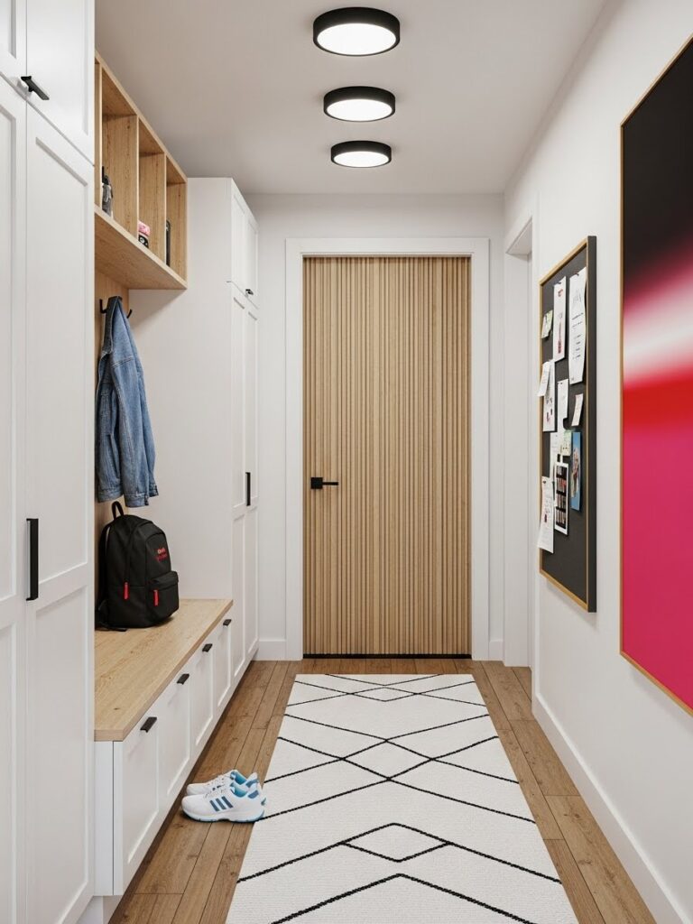 If your entryway has a coat closet, the swing of a traditional door can eat up 3 feet of usable space. Replace it with a sliding barn door or a bi-fold door. This allows you to place furniture closer to the closet entrance and eliminates the awkward “door dance” when guests arrive.