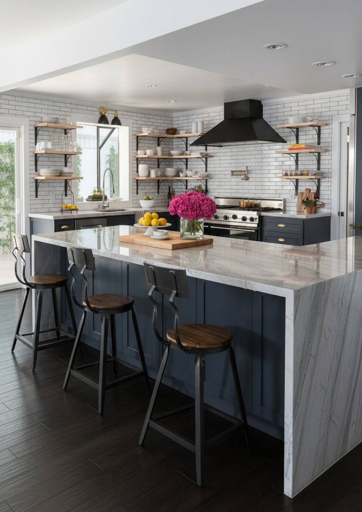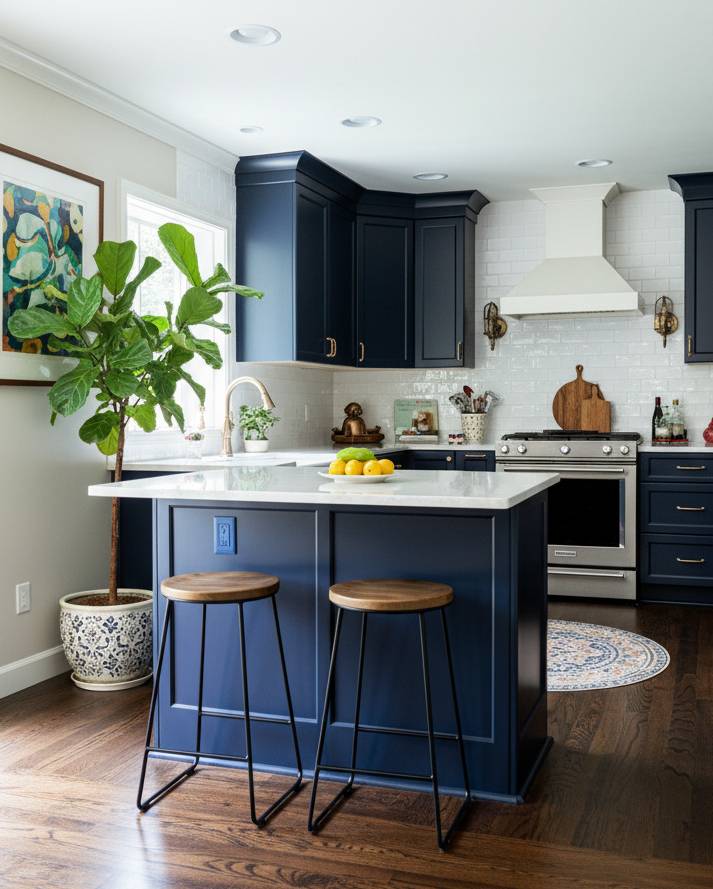 A dark navy or green island looks stunning. It anchors the room visually. It makes the island look like furniture.
